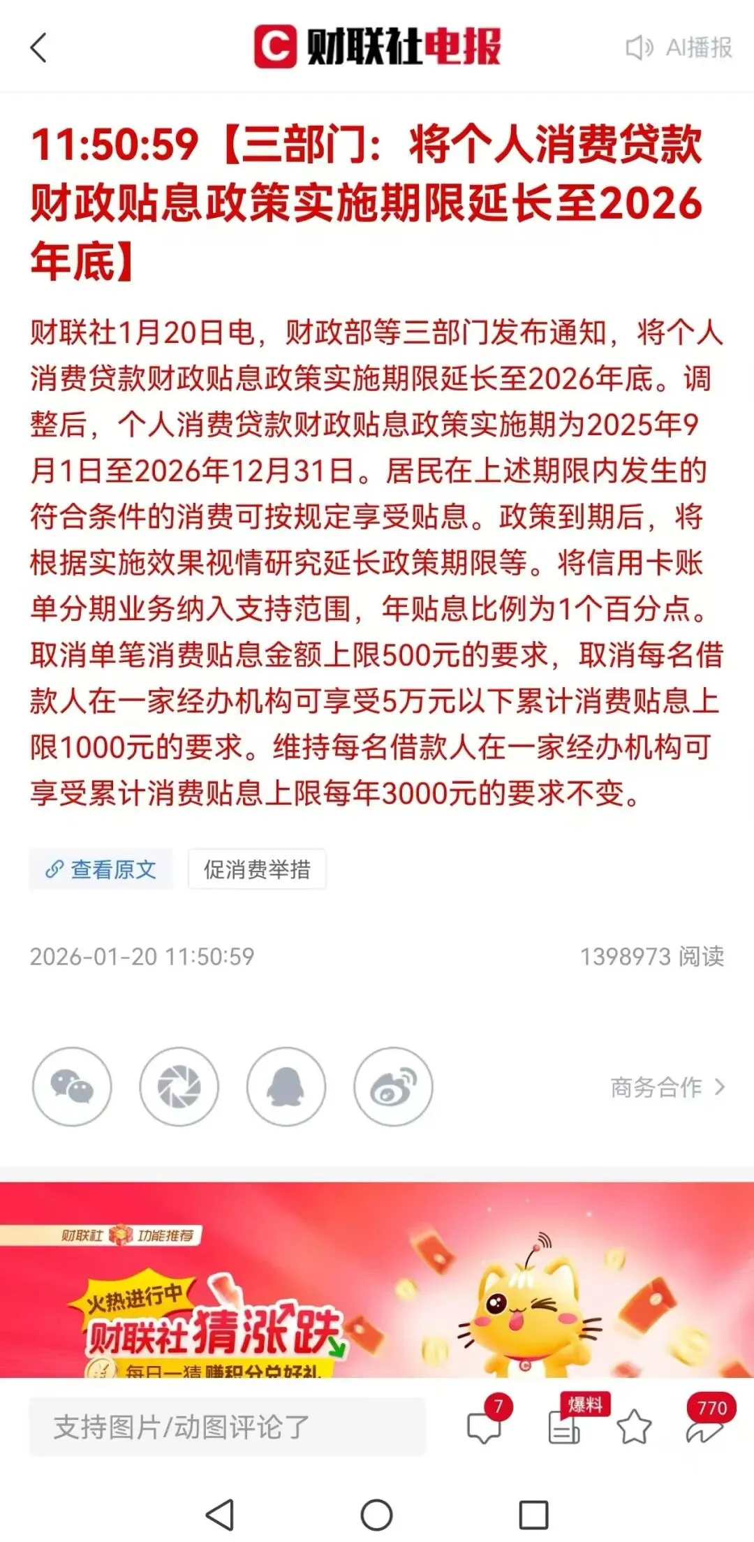 大家好,我是老陈,在广州做助贷十来年了。今天中午,财联社发了一条重磅消息,我第一时间就看到了——个人消费贷款财政贴息政策,延期到2026年底了!