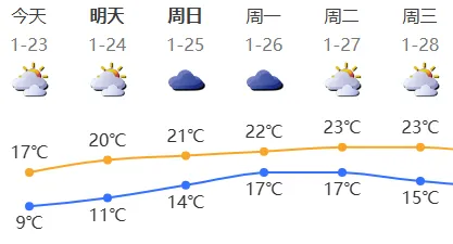 1月23日,阴天转多云,早晚寒冷;气温9℃—17℃;东北风2级—3级;相对湿度45%—65%。