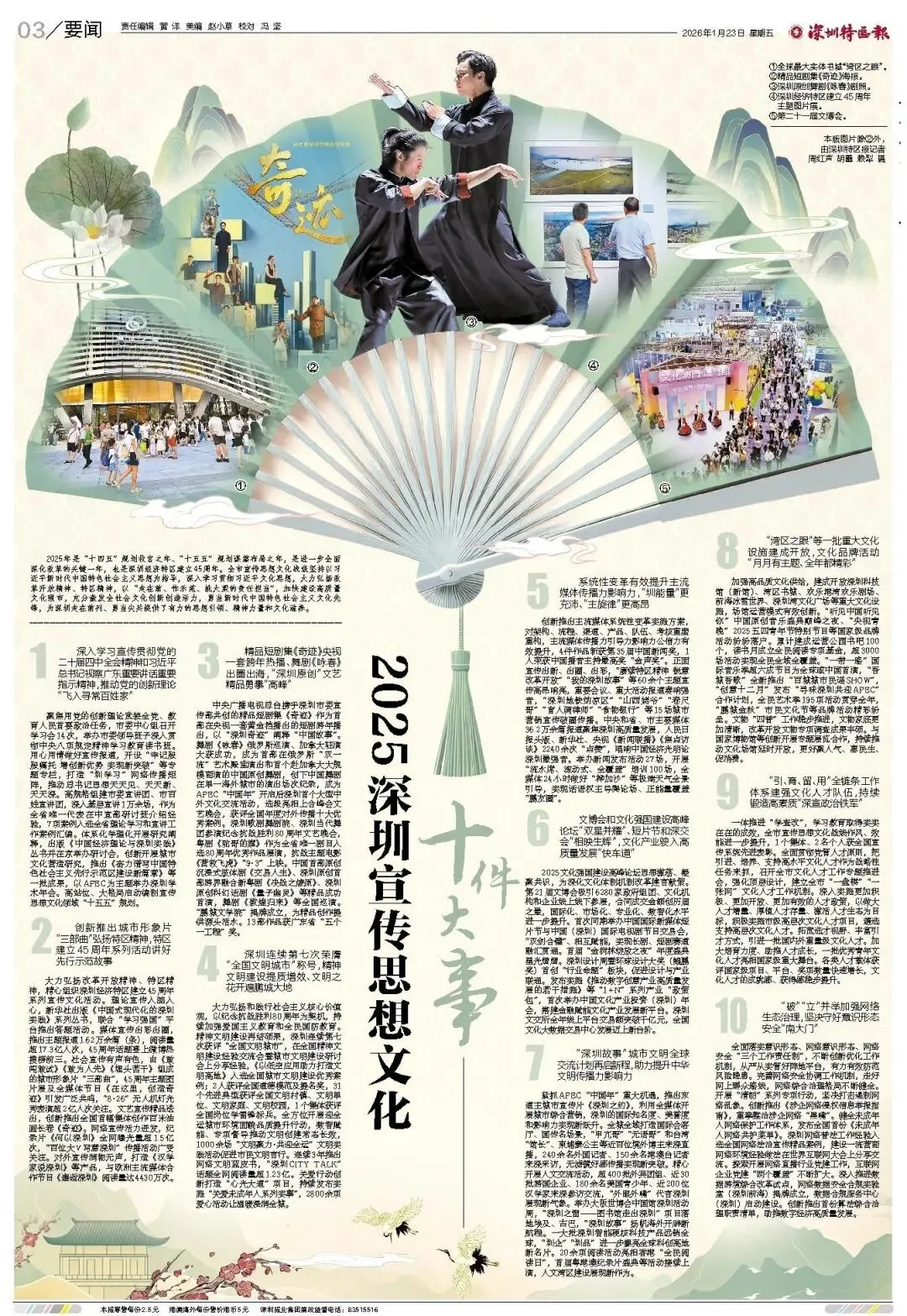 中央广播电视总台携手深圳市委宣传部共创的精品短剧集《奇迹》作为首部在央视一套黄金档播出的短剧跨年播出,以“深圳奇迹”阐释“中国故事”。舞剧《咏春》俄罗斯巡演、加拿大驻演大获成功,成为首部在俄罗斯“双一流”艺术殿堂演出和首个赴加拿大大规模商演的中国原创舞剧,创下中国舞剧在单一海外城市的演出场次纪录,成为APEC“中国年”开启后深圳首个大型中外文化交流活动,选段亮相上合峰会文艺晚会,获评全国年度对外传播十大优秀案例。深圳歌剧舞剧院、深圳当代舞团参演纪念抗战胜利80周年文艺晚会,粤剧《驼哥的旗》作为全省唯一剧目入选80周年优秀作品展演,抗战主题电影《营救飞虎》“9.3”上映。中国首部原创沉浸式肢体剧《交易人生》、深圳原创首部跨界融合新粤剧《决战之燎原》、深圳原创科幻话剧《量子幽灵》等精品成功首演,舞剧《敦煌归来》等全国巡演。“鹏城文学院”揭牌成立,为精品创作提供源头活水。13部作品获广东省“五个一工程”奖。