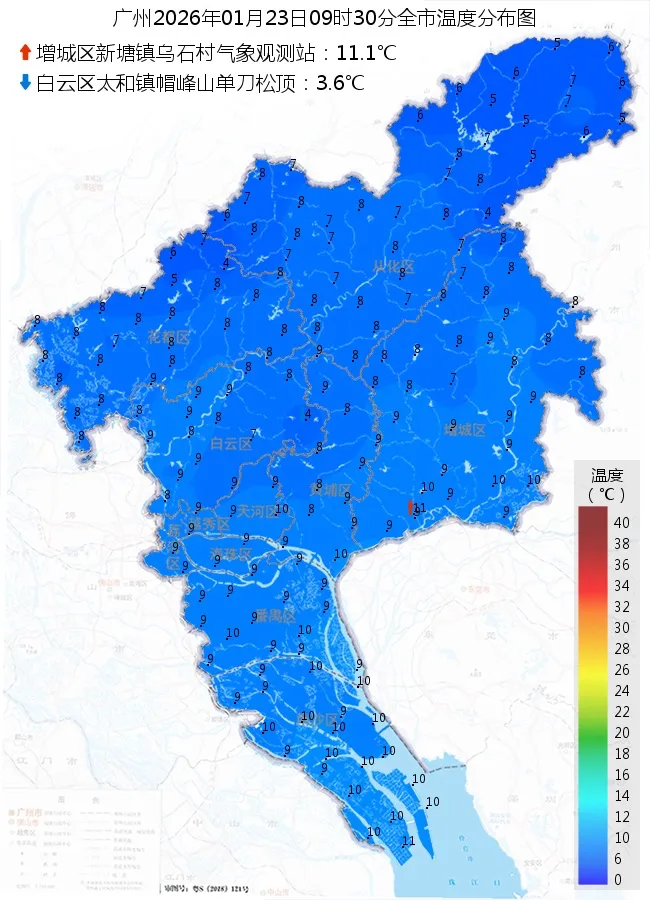 广东省气象台预计,1月23日早晨,粤北市县有大范围5℃以下的低温天气,高海拔山区—4~0℃,有冰(霜)冻,局部有冻雨或雨夹雪。1月23日白天—24日广东多云到晴天,早晨有轻雾局部有雾,昼夜温差大。1月25日,广东大部分市县阴天,有小雨或雾。