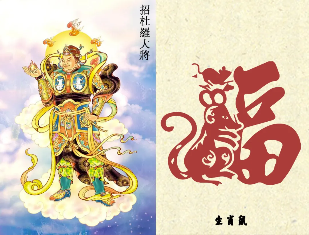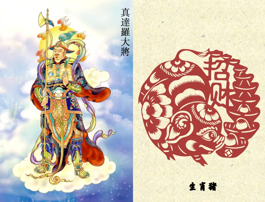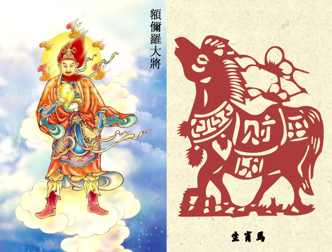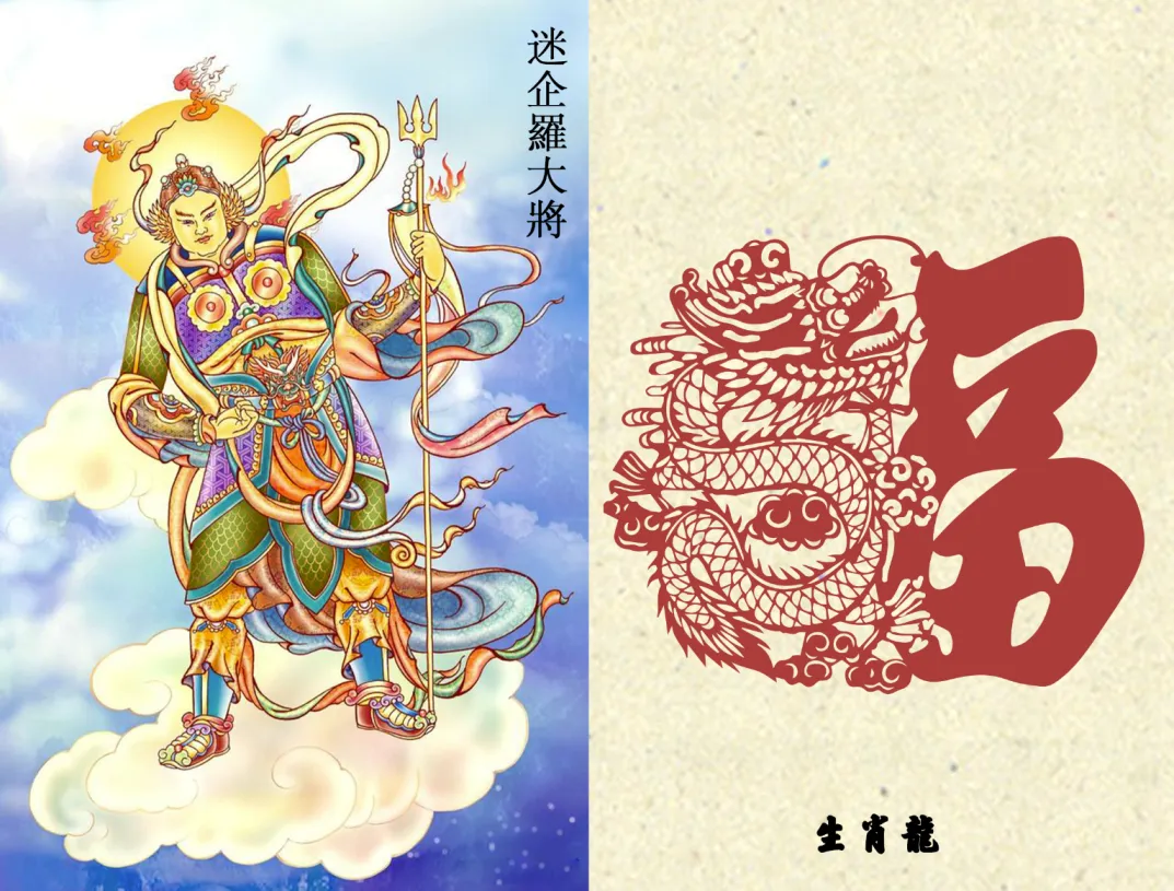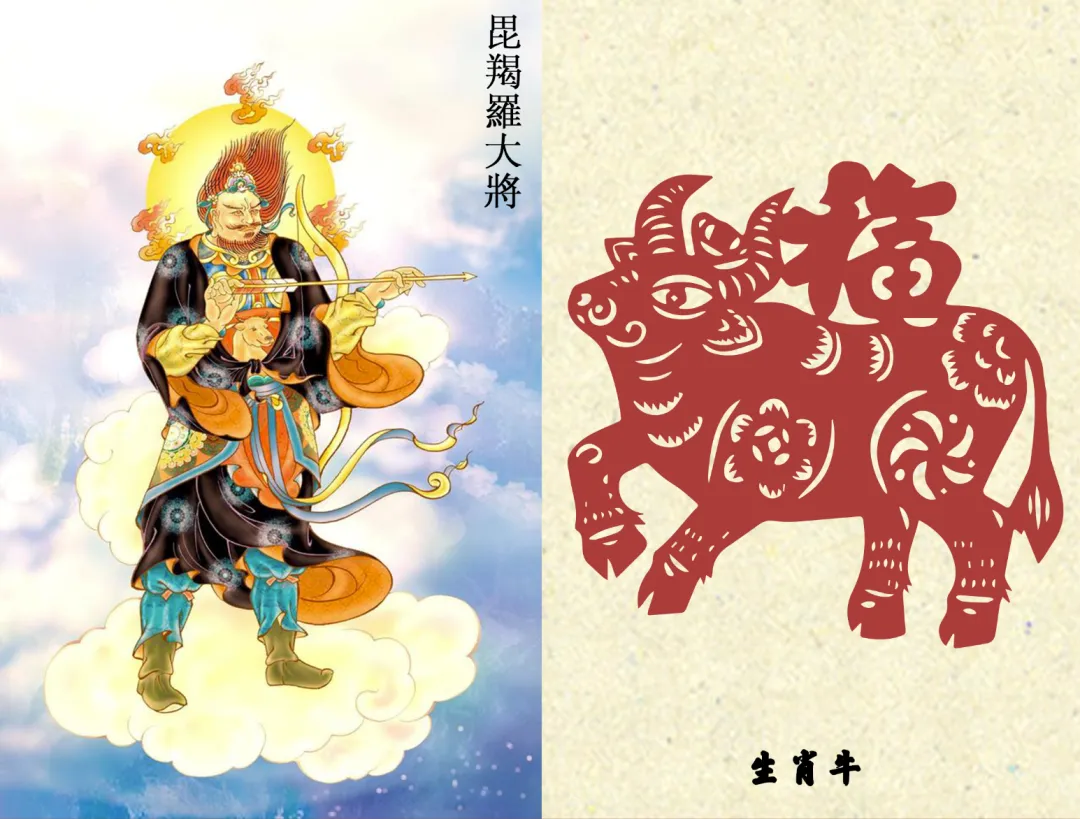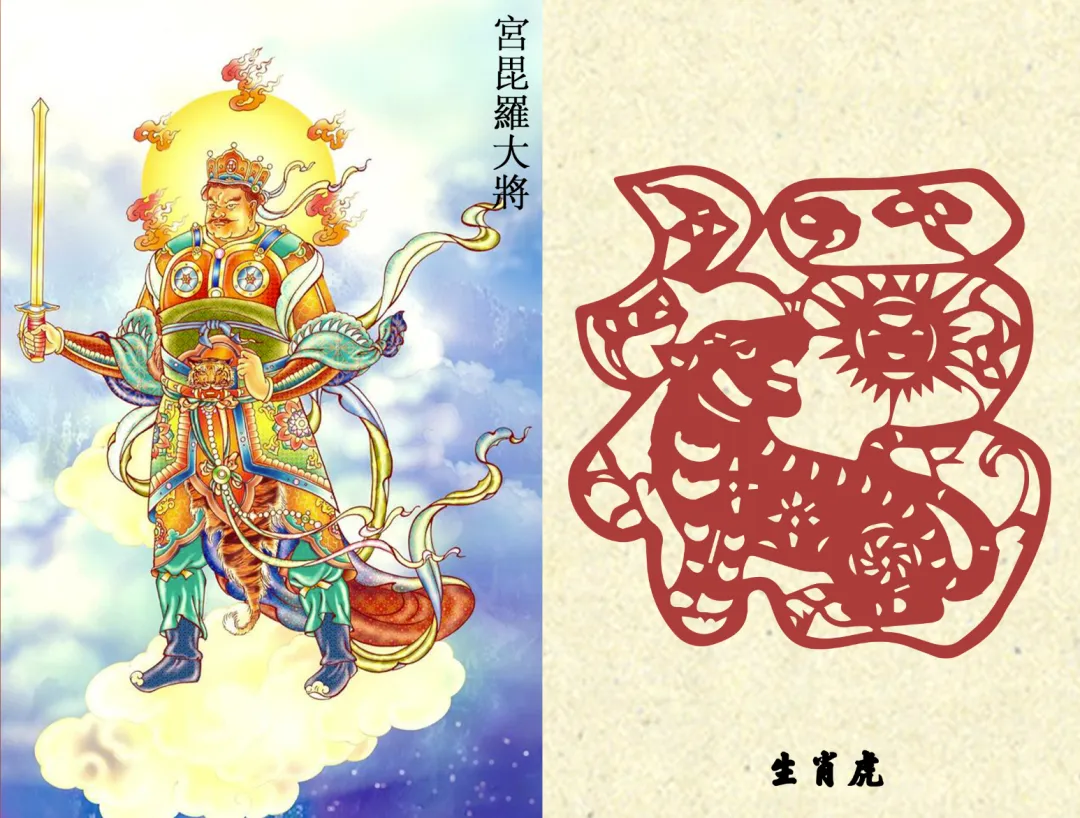 据《药师法仪轨》:一年十二月,每天十二时辰,由一药叉大将轮值守护,与十二生肖一一对应,药师佛行菩萨道时,发十二大愿,化身十二药叉大将,每一药叉为每一大愿的象征,令诸有情者所求皆得。