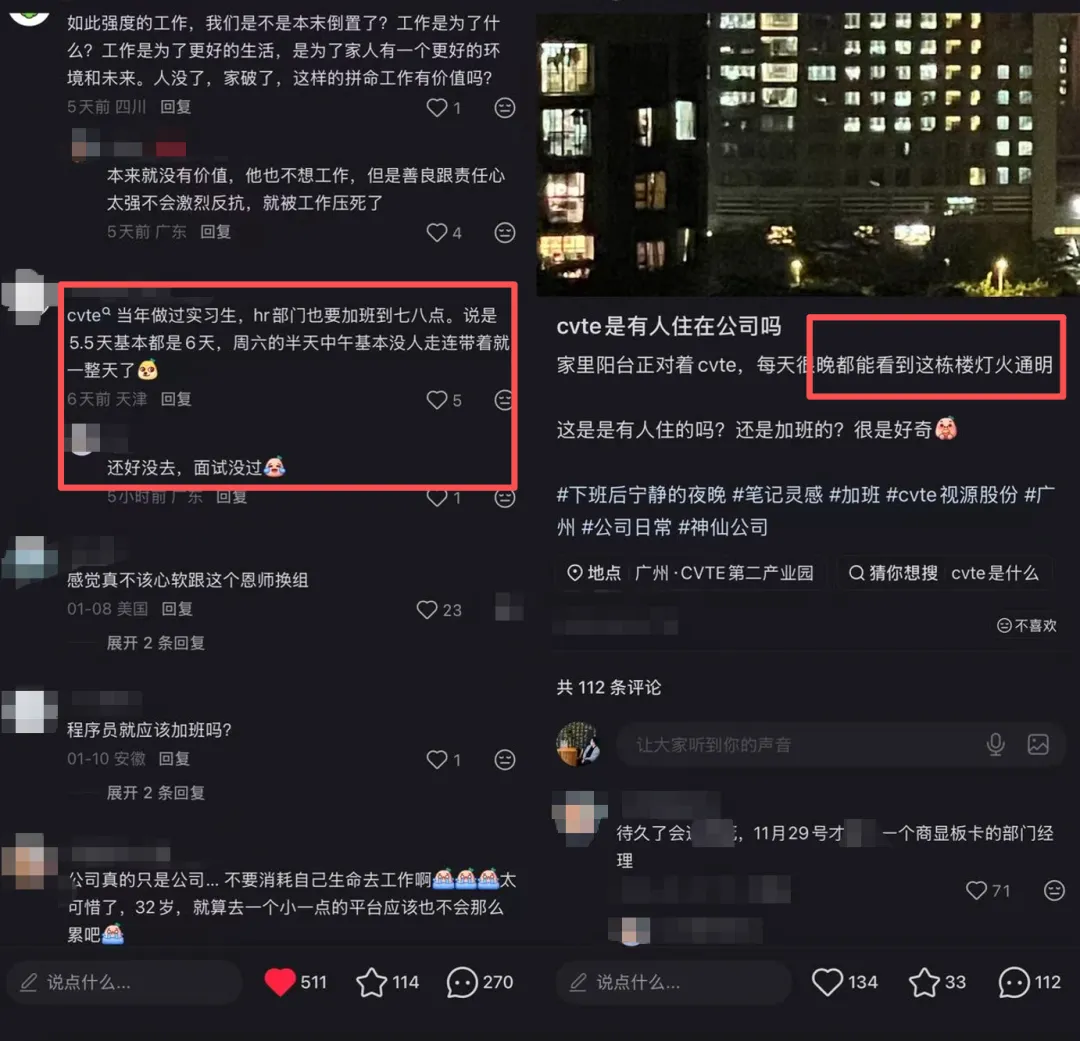 记者在招聘平台看到,视源股份多个岗位如高级软件工程师、显控硬件工程师等,均要求“抗压能力强,能够承受较大工作压力”。社交媒体上也有不少网友反映,公司加班普遍,办公大楼常至深夜仍亮灯。