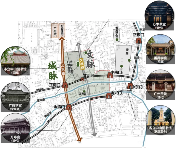 文德南历史文化街区自古以来是广州的“文轴”所在,集聚广府学宫、南海学宫、广州贡院、大小马站书院群等文教地标。1918年开辟文德路、1919年拆城墙通万福路、1922年拆城墙建文明路至今,街区仍保留“城-濠-街-坊”的完整格局,但也面临历史建筑老化、生活设施陈旧、功能业态单一等广州老城历史街区衰败的共性问题。