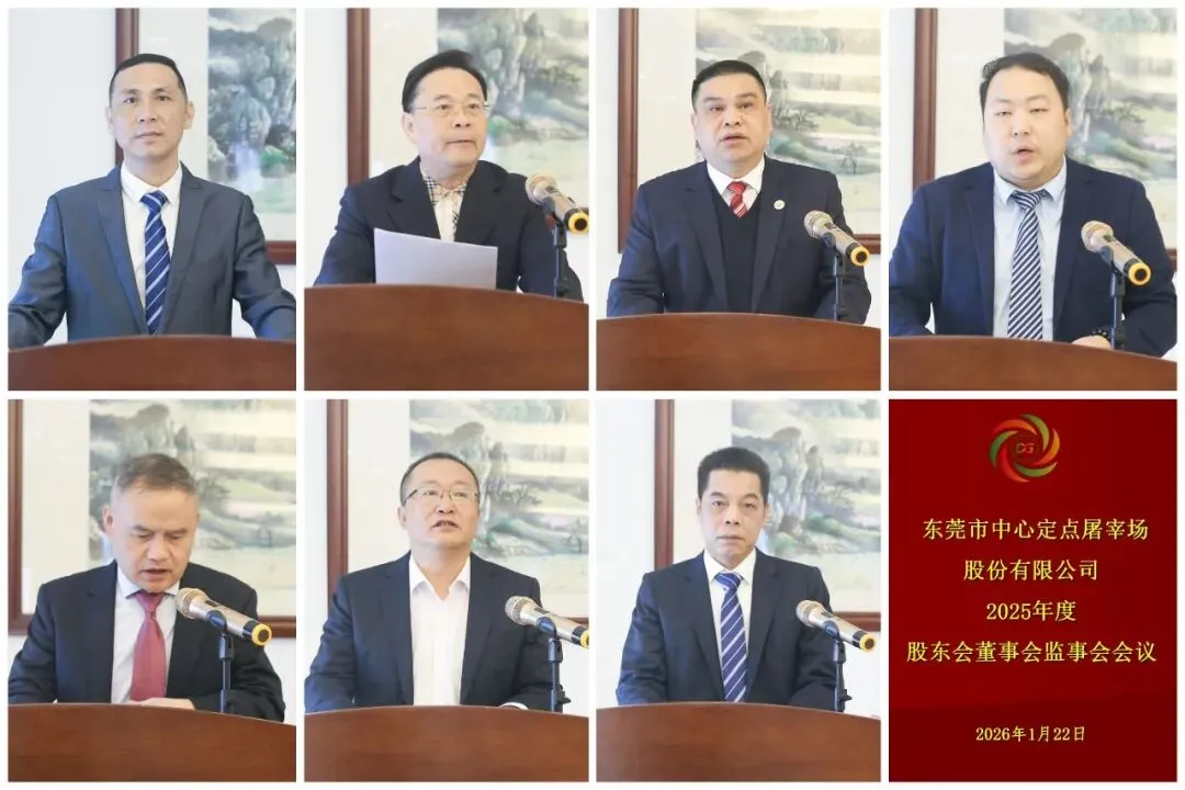 2026年1月22日上午,东莞市中心定点屠宰场股份有限公司(以下简称“东莞市中心定点屠宰场”)成功召开2025年度股东会、董事会及监事会会议。东莞市中心定点屠宰场董事长刘志扬、总经理刘林,“三会”全体成员及公司高层管理人员近30人出席会议。会议由东莞市中心定点屠宰场董事黄水平主持。