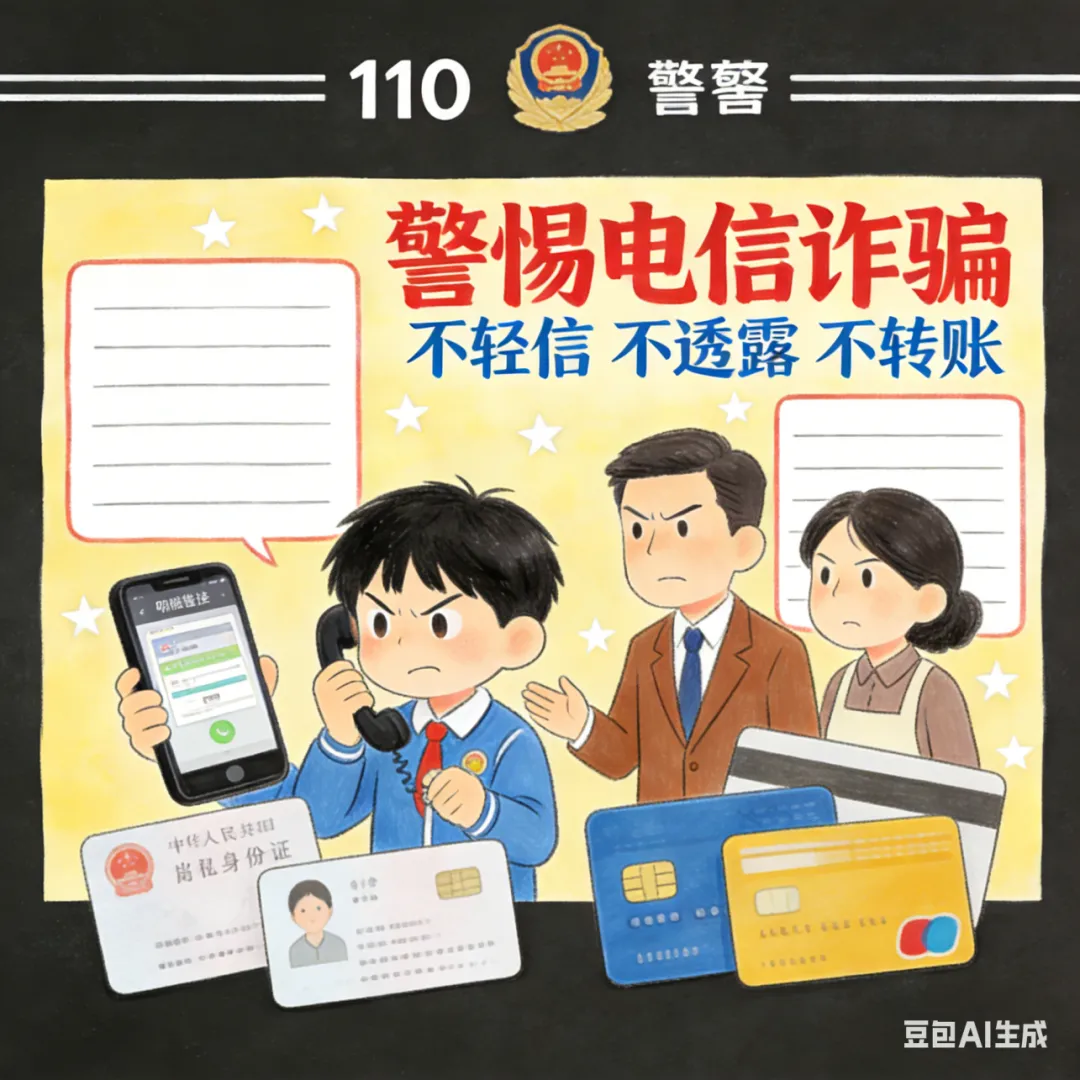 寒假以及“春节”期间,是电信网络诈骗的高发时段,请家长与孩子一同提高警惕。引导孩子树立防范意识,牢记“三不一多”原则:不轻易相信陌生来电,不点击不明链接,不随意透露个人及家庭的身份证号、银行卡号、验证码等敏感信息,不向陌生账户转账汇款。若遇到可疑情况,务必在第一时间告知家长,或者直接拨打110报警电话,谨防上当受骗。