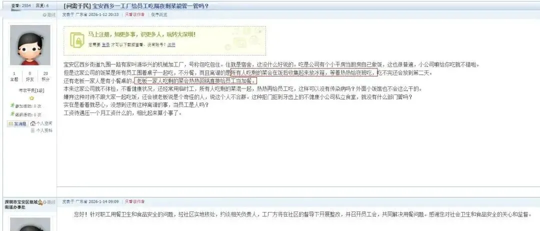 1月14日,宝安区航城街道办回复该网友表示,针对职工用餐卫生和食品安全的问题,经社区实地核处,约谈相关负责人,工厂方将在社区的督导下开展整改,并召开员工会,共同解决用餐问题。