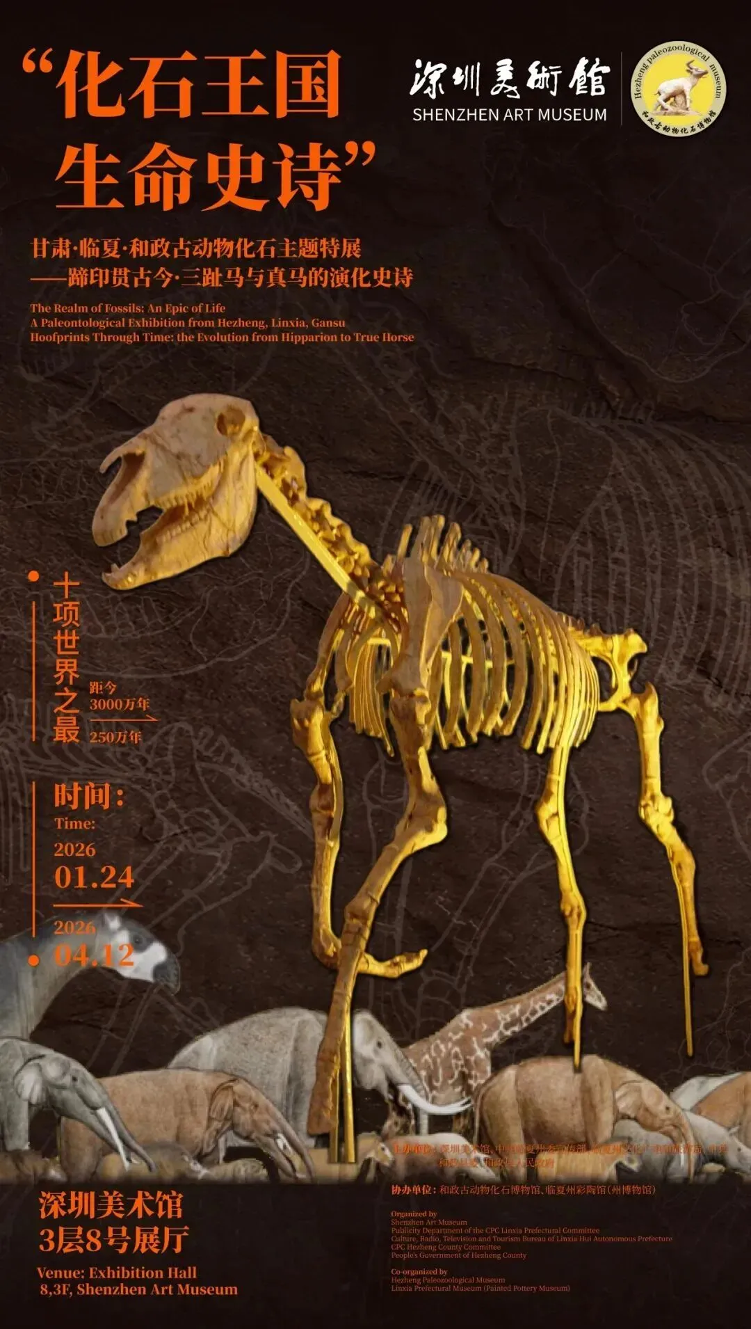 本次展览以“蹄印贯古今——三趾马与真马的演化史诗”为主题,精选甘肃和政地区珍稀马类化石,系统呈现马类从多趾到单蹄的演化历程。展览以时间轴为线索,融合科学叙事、生态复原与互动体验,讲述三趾马与真马动物群的更替,带领观众穿越千万年,感受生命演化的壮阔与奥秘。