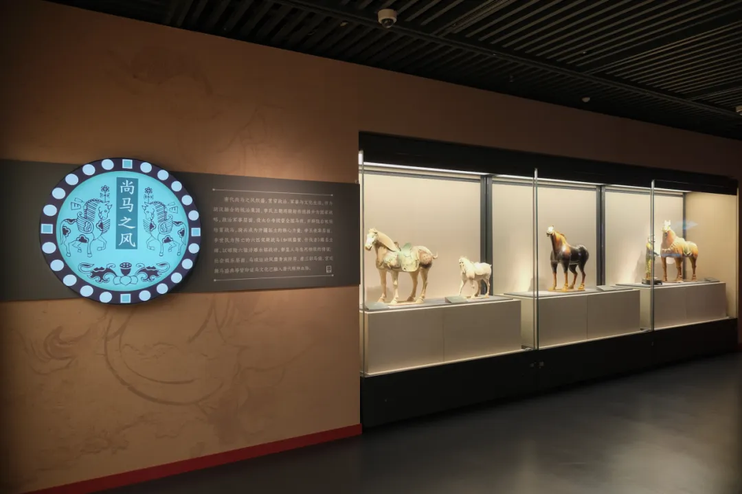 该展借展陕西唐三彩艺术博物馆收藏的彩绘陶马球俑、三彩舞马三彩噬蹄马、三彩凤首壶等各类唐代文物珍品42组60件集中呈现了色彩斑斓、造型精妙的唐三彩艺术之美。