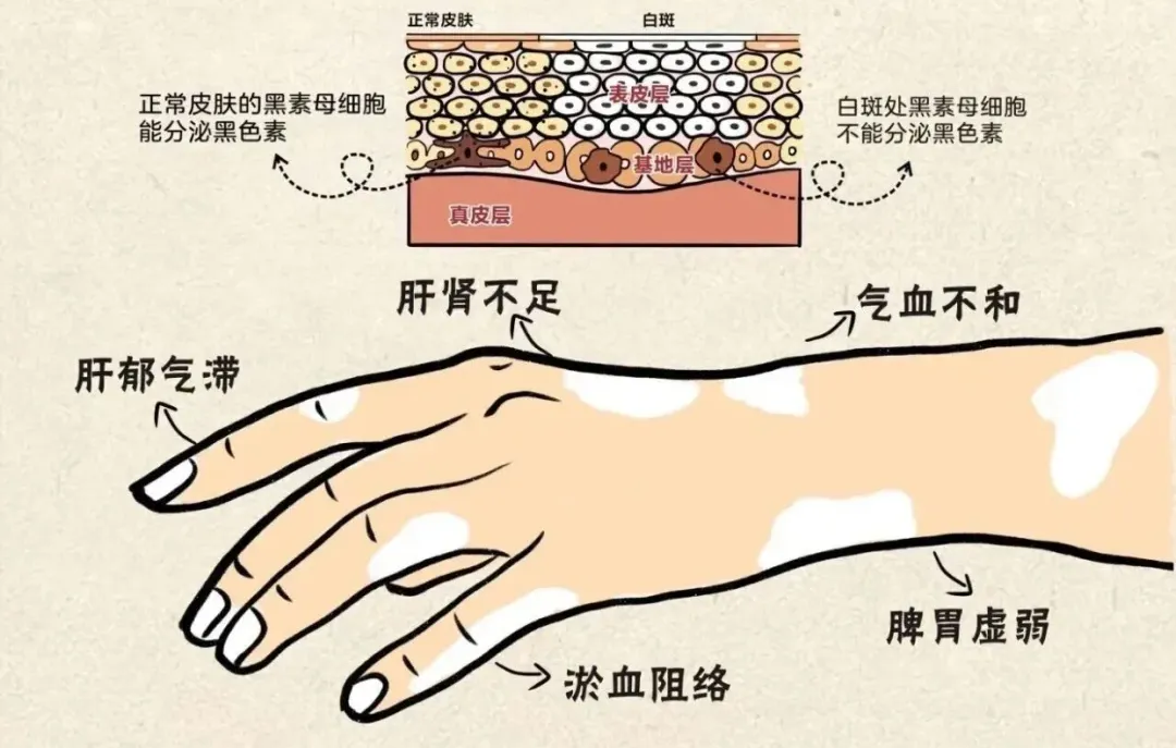 西医认为,遗传、免疫紊乱、外伤、精神压力等是主要诱因;中医则指出,肝肾不足、气血不和、肝郁气滞、淤血阻络、脾胃虚弱等脏腑失调,是黑色素生成障碍的根源,内外因叠加,最终诱发白斑。