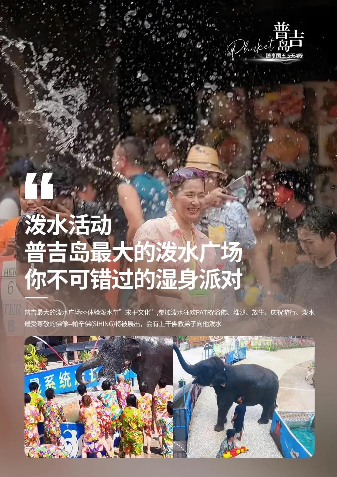 早餐后,前往【佛吉水舞】宋干文化旅游景区,是泰国普吉岛较大的泼水狂欢主题活动旅游景区,在这里可以拜佛、浴佛、放花灯、祈福,观赏泰国民俗舞蹈,参与大型的泼水狂欢,非常震撼。该景区可容纳 2000 人同时泼水狂欢,想了解泰国的泼水文化,一定要去体验和参与泼水哦,去感受泰国泼水节给人们带来的开心和快乐。