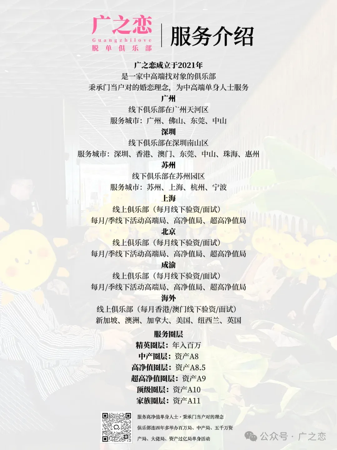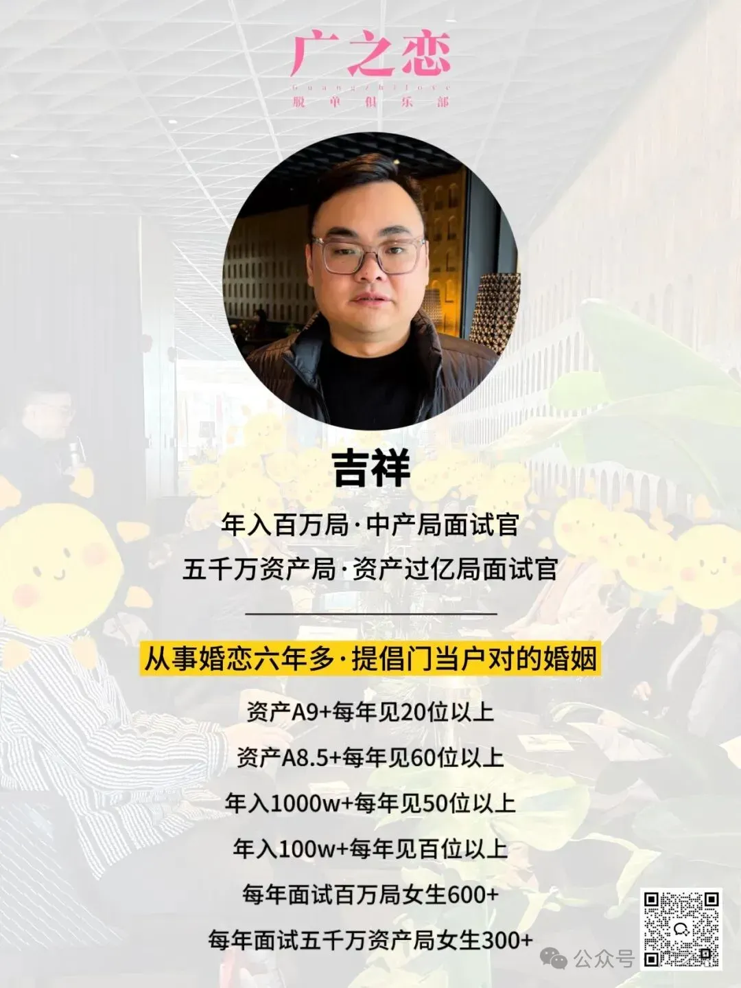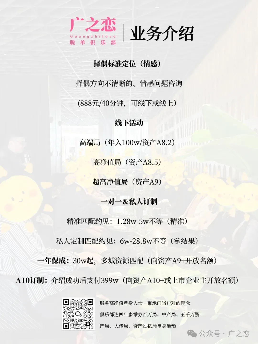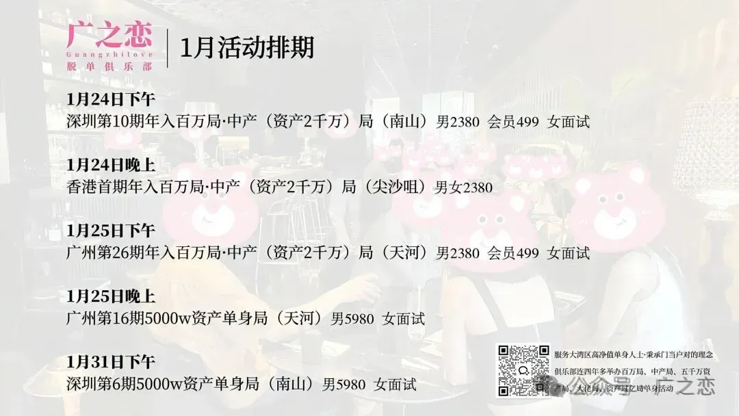 1.在没有确认关系前,双方不要有金钱或贵重礼物往来。2.在活动上认识发展了关系,最后因为某些原因不合适分手了,希望双方都能体面的分手,好聚好散,不要开撕等,更不要找我们麻烦。4.我算是在广深港佛莞见了不少的有钱人,年入百万.中产放在大湾区任何一个城市都是一件很牛掰的事情,对收入或资产累积的时间没有概念是一件非常可怕的事情,尤其是放在择偶婚姻的事情上。5.婚姻不是人生的必选项,但如是你的必选项,那么越早越好。6.年轻的时候选择了搞钱,年龄大了才想起自己需要婚姻的,那么就要有这个年龄该有的“成熟与取舍”,而不是依然按照年轻的择偶要求来,我深知这种人非常非常多,ta们进入婚姻概率堪比“中彩票”。7.邀请到线下面试并不代表一定能通过,不通过也不代表不优秀,只能说明前面已通过的更优秀而已。面试时千万别问“我的颜值多少分”,我没有资格或义务去评。面试别迟到,提前安排好时间,没必要干等。8.经常被问我能找到什么样的,我的条件放在那个群体是有优势的,什么人群会和我结婚等等问题,没有付费的情况下我是不会说的,说了也不一定是真的,我也要吃饭的,拿钱换吧!曾经的我也苦口婆心、认真的给过分析与建议,最后给我发了一张“好人卡”。9.绝大多数人都高估的自己的行情,能来俱乐部的男女生现实生活中都不缺异性,只是大家想找更合适的进入婚姻。找对象生活中捡漏的可能性最大,相亲市场不可能,特别是有的男生,来了相亲市场后犹如打开了“新世界”。10.婚姻门当户对,各有所图,永不过时。别总一味的想自身的需求,多想想自身的能提供的价值。别总一味的想对方付出,多想想自身付出了什么。家庭生活中经济地位决定了话语权,这点认知都不具备的别进入婚姻。深圳第二期百万.中产局现场