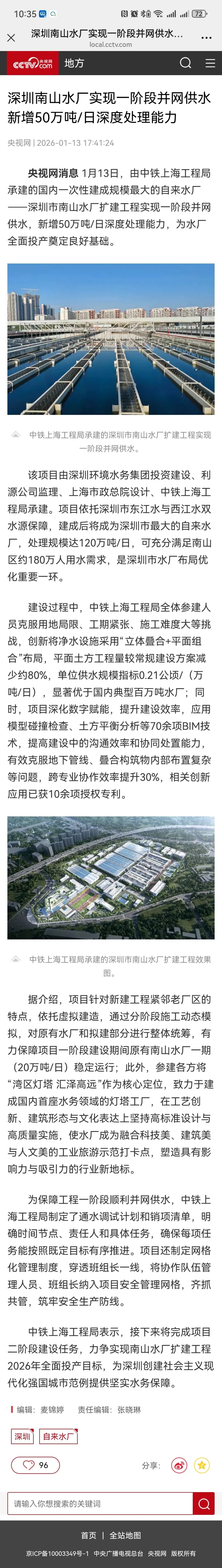 央视网:深圳南山水厂实现一阶段并网供水新增50万吨/日深度处理能力