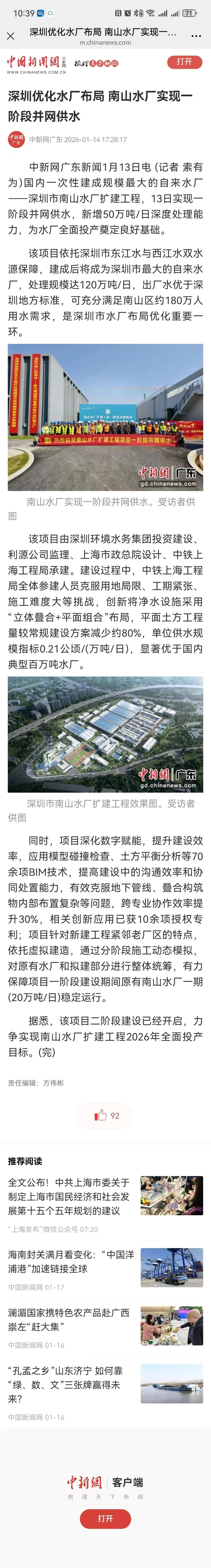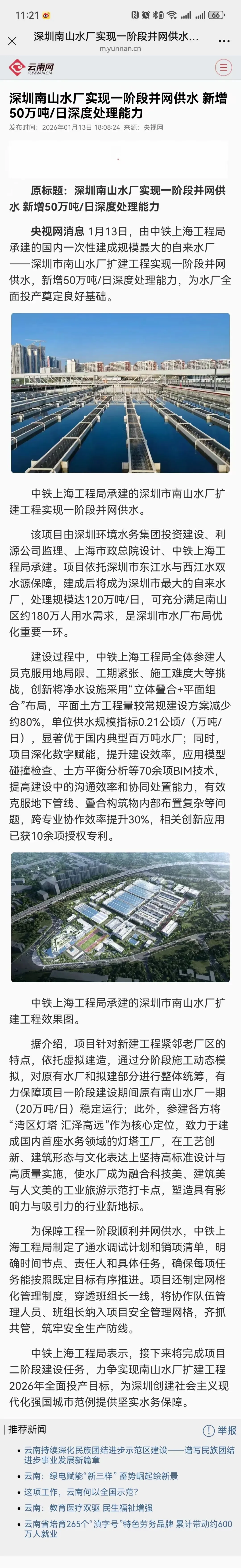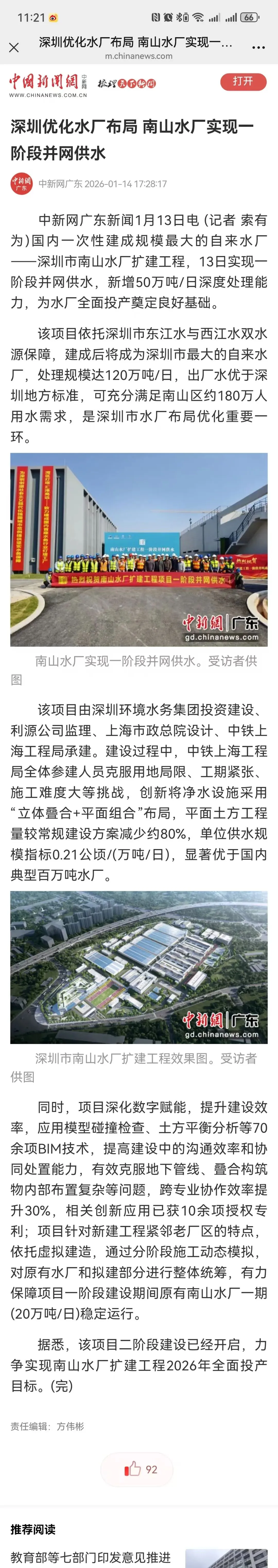 中国新闻网广东:深圳优化水厂布局 南山水厂实现一阶段并网供水