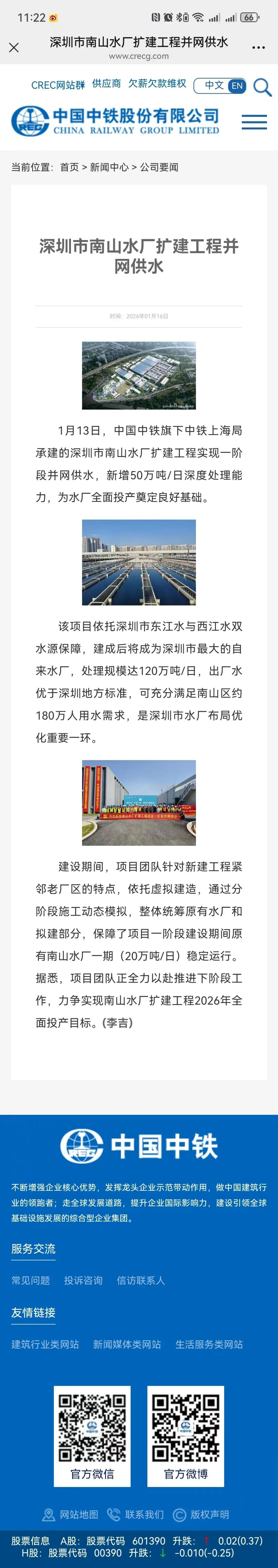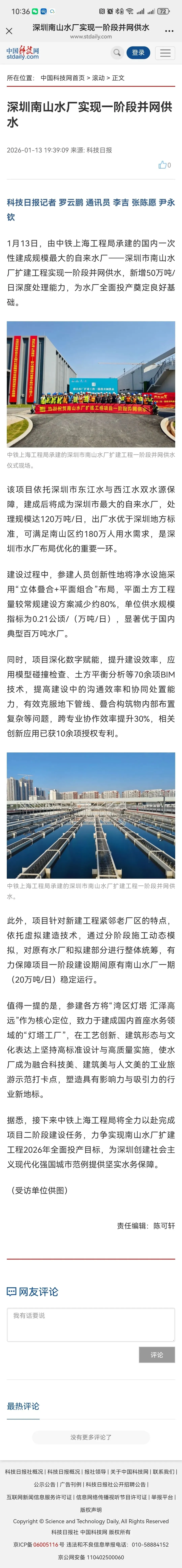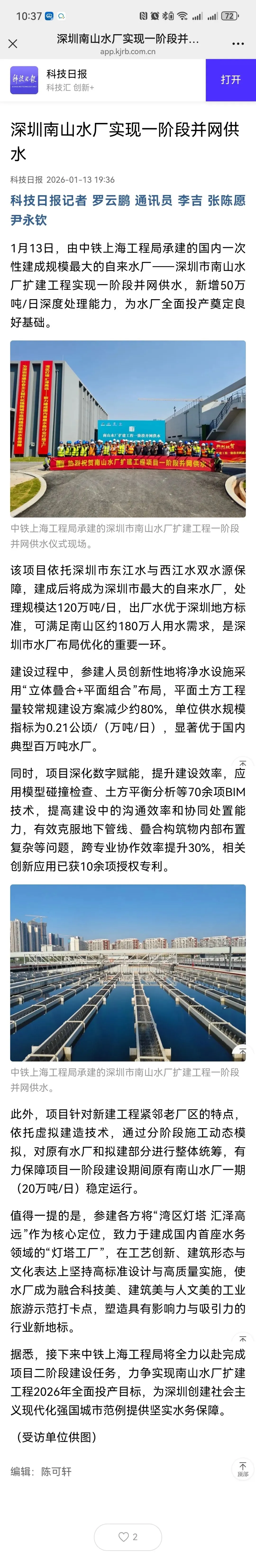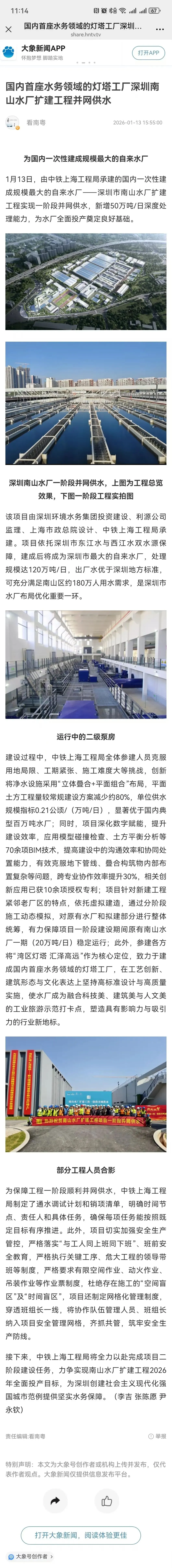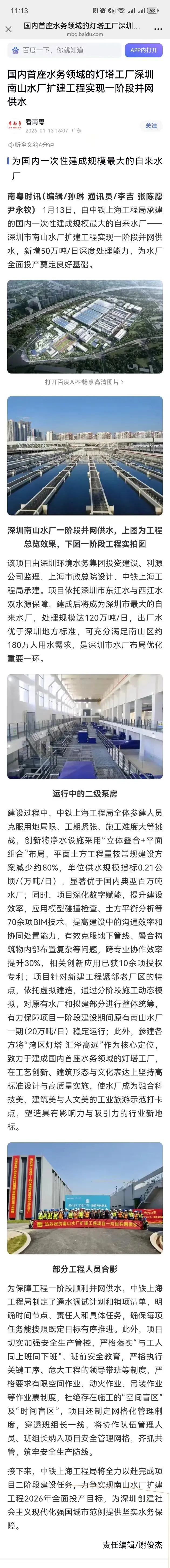 近日,中铁上海工程局参建的国内一次性建成规模最大的自来水厂——深圳市南山水厂扩建工程实现一阶段并网供水,新增50万吨/日深度处理能力,为水厂全面投产奠定良好基础。