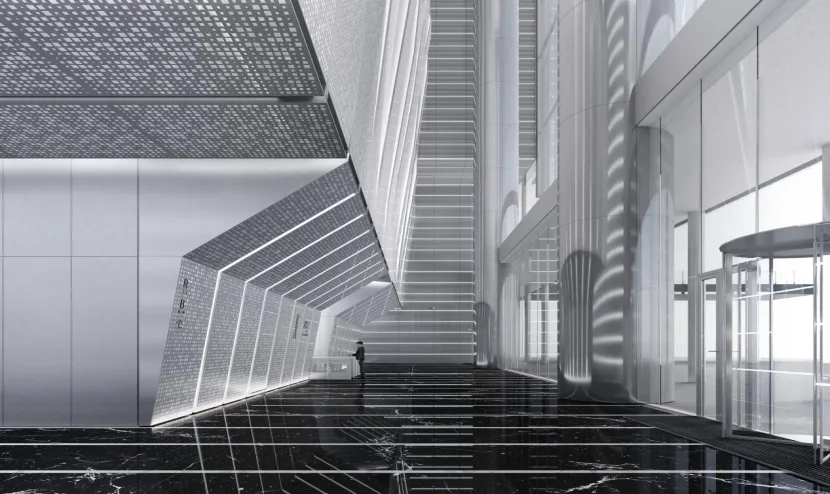 △GICC大堂效果图,采用新型蚀刻阳极氧化铝板