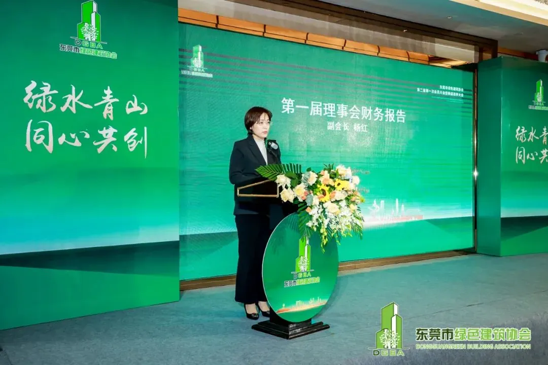 全体与会会员对《第一届理事会工作总结报告》表决通过我会副会长杨红(广东汇旭建设工程有限公司总经理) 作第一届理事会财务报告。