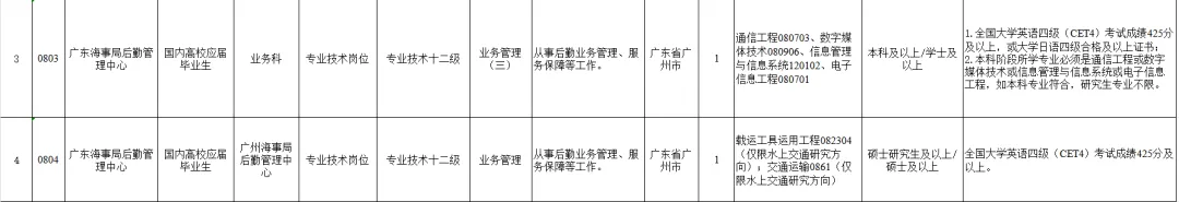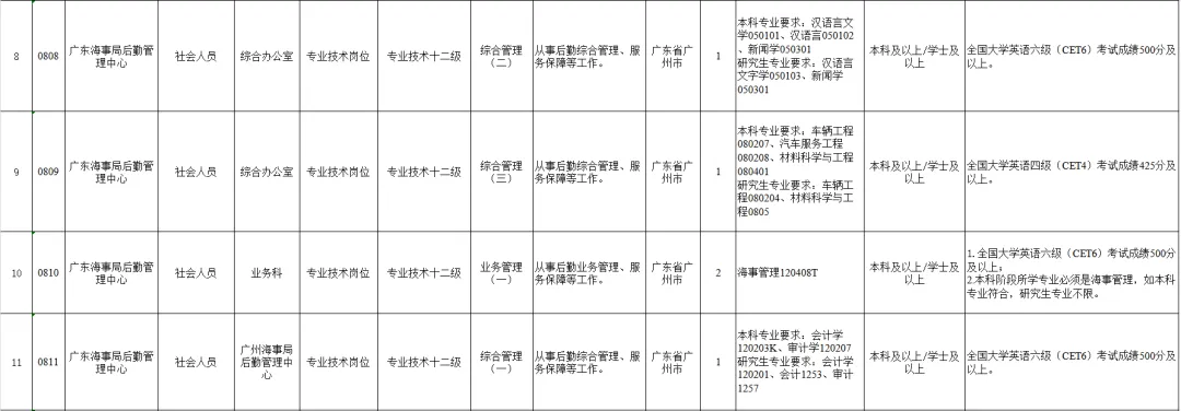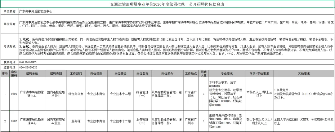 参加本次统一公开招聘的单位为交通运输部北海航海保障中心、交通运输部东海航海保障中心、交通运输部南海航海保障中心、中国船舶油污损害理赔事务中心、上海海事局后勤管理中心、辽宁海事局后勤管理中心、河北海事局后勤管理中心、广东海事局后勤管理中心、广西海事局后勤管理中心、湛江海事局后勤管理中心。各招聘单位岗位信息和相关要求详见《交通运输部所属事业单位2026年度第四批统一公开招聘岗位信息表》(附件1,以下简称《岗位信息表》)。