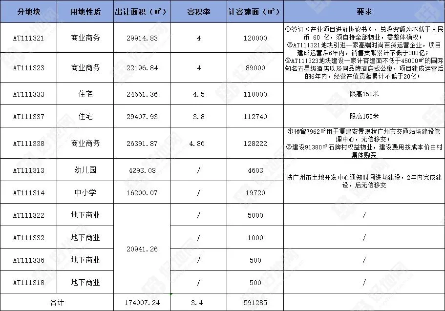 ③AT111338地块为商业商务用地,竞得人须预留7962㎡用于复建安置现状广州市交通站场建设管理中心,建成后无偿移交;竞得人须建设91380㎡石牌村权益物业,建设费用按成本价由村集体购买。