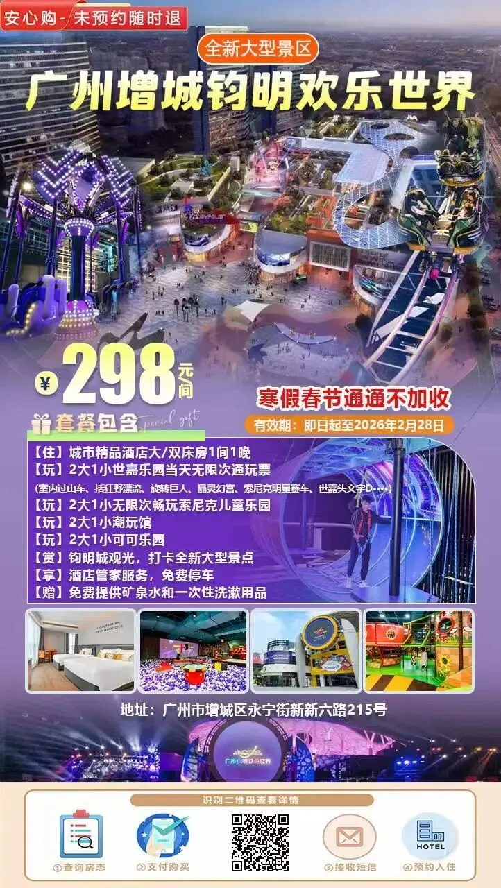 3、广州钧明欢乐世界位于广州增城永宁街道,占地约9万平方米,总建筑面积约18万平方米,共有四个室内IP乐园,分别为全年龄段通玩的广州华夏世嘉都市乐园、《穿越火线:火线战场》综合乐园,适合低年龄层少儿玩耍的刺猬索尼克乐园、可可乐园两大儿童乐园