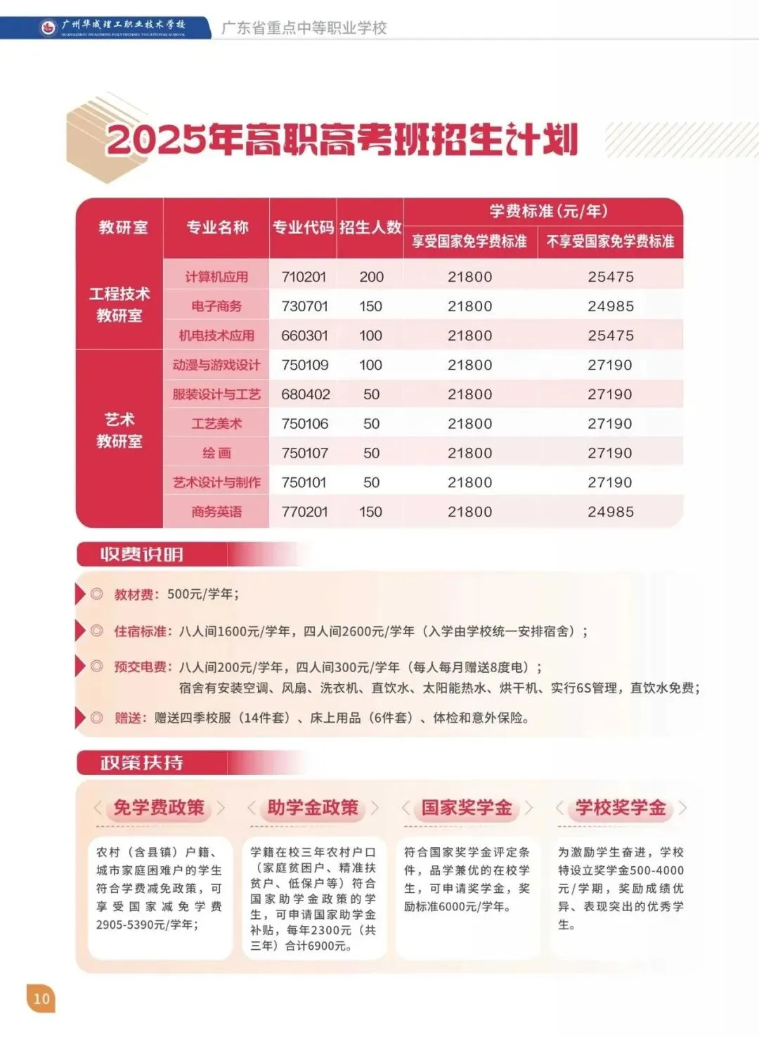 1.住宿标准: 高职高考班8人间1600元/学年,职普融通班4人间2600元/学年(入学时由学校统一分配宿舍);