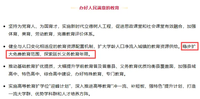 其实,此前十五五规划建议第39条“办好人民满意的教育”写道:稳步扩大免费教育范围,探索延长义务教育年限,将十二年义务教育再次推至风口浪尖。