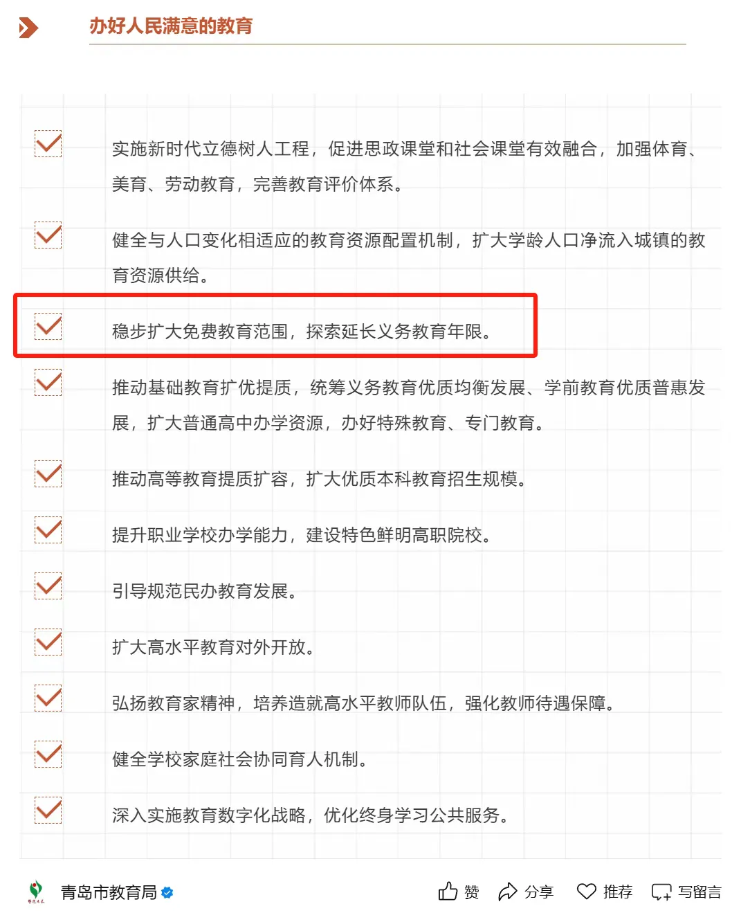 同时提出稳步扩大免费教育范围,探索延长义务教育年限。