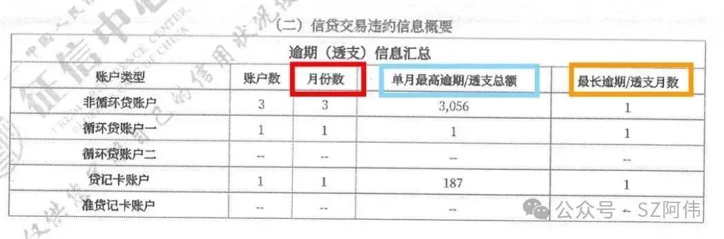 ▪️左边红框里的“月份数”,指的是总共逾期次数,可以看到总共有5次逾期。