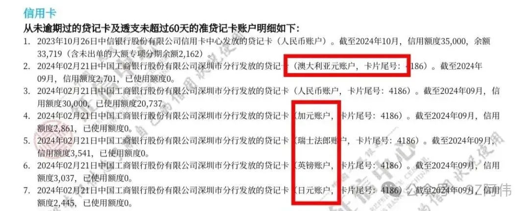 上图的客户有2张信用卡,但是有7个信用卡账户,其中工行的信用卡里面就包含了6个账户数量,因为有的信用卡开通时,它会同时开通多个账户,比如上图的日元账户、加元账户等等。