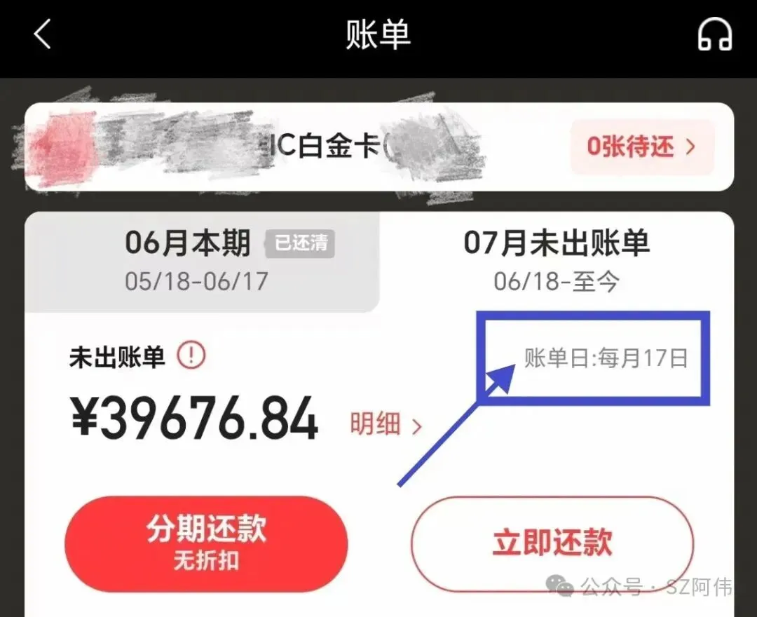 市面上常用的方法就是过零账单,以下图某银行信用卡为例子,图片显示账单日是每月17日,过零账单养护就是在16日前把信用卡欠款结清,然后等19日再刷出来。