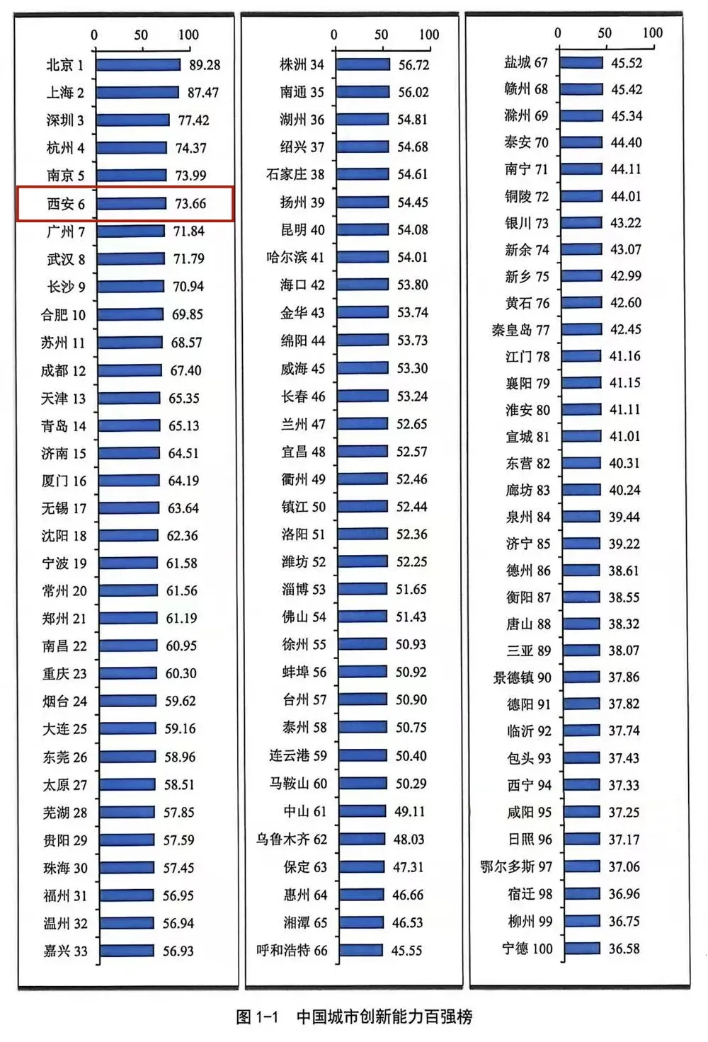 值得注意的细节是,排名最高的北京,创新能力指数为89.28,但多达77个城市创新能力指数值低于60,其中,17个城市甚至低于40,最后一名福建宁德市36.58,“初来乍到”的咸阳以37.25就挤在这一不到4分之差的狭小区间里。这表明,各个城市之间创新能力差距还比较大,创新发展不平衡局面也有待打破。