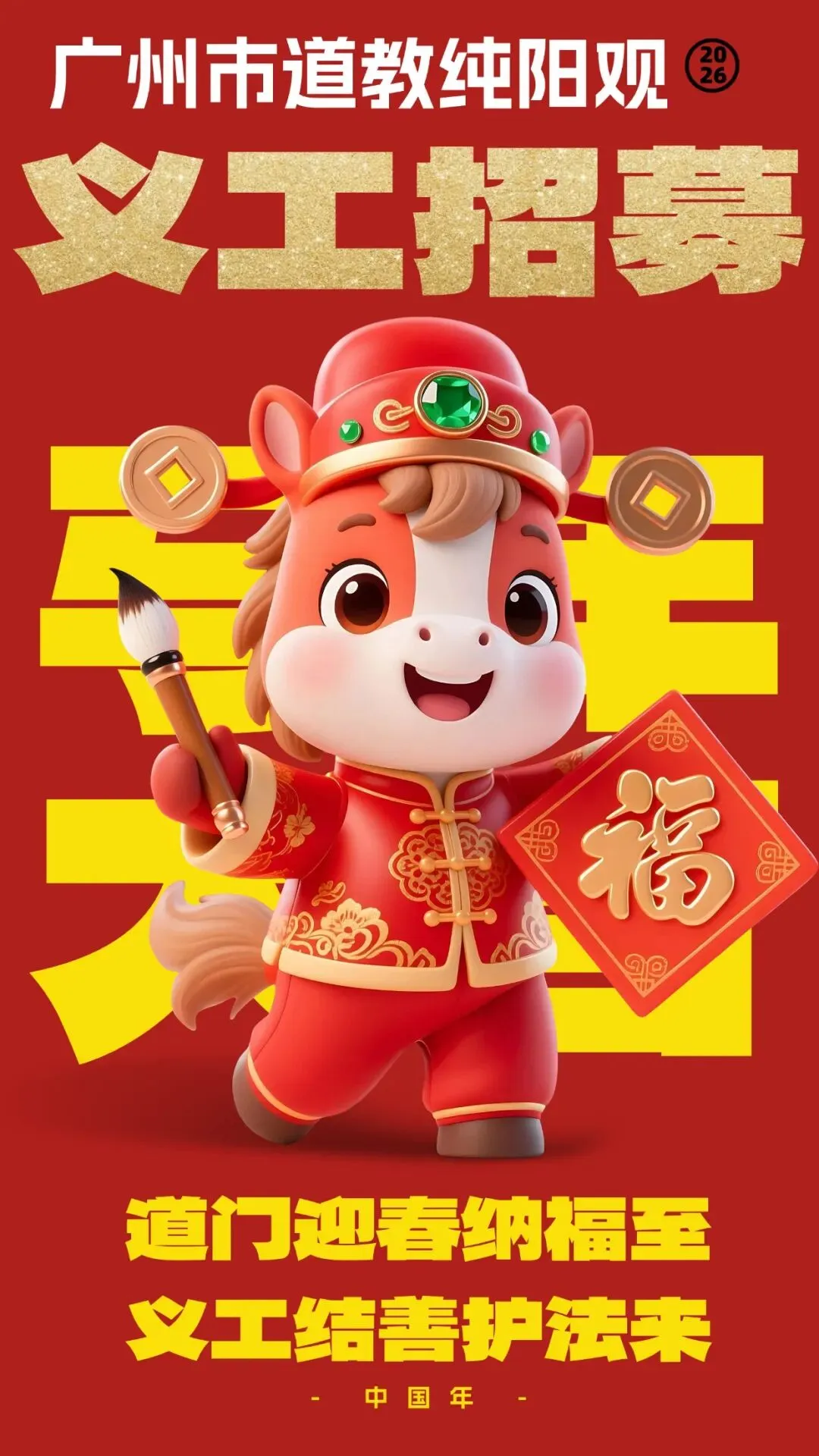 广州纯阳观作为传承中华道教文化的圣地,承载着厚重的文化底蕴与无尽的福泽。值此丙午年农历新年即将降临之际,为更好地弘扬道教文化,服务广大信众,确保每一位来访者都能感受到道教文化的深厚底蕴与温暖关怀,我们急需一批热心公益、愿意奉献的义工朋友,协助道长及道众做好节日期间的各项服务与管理工作。