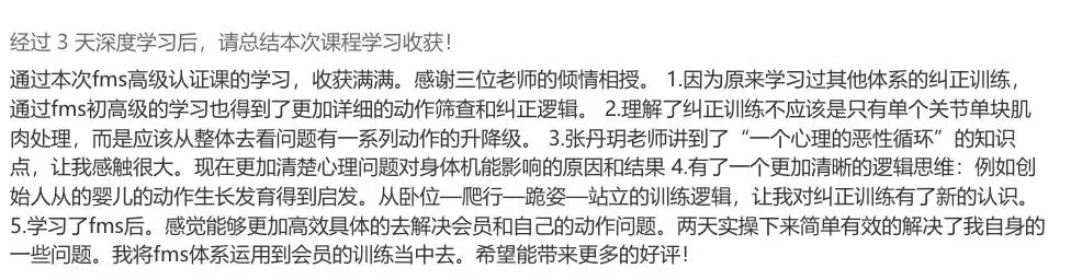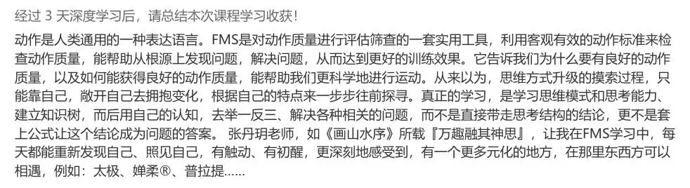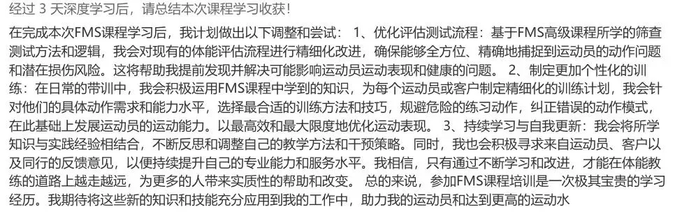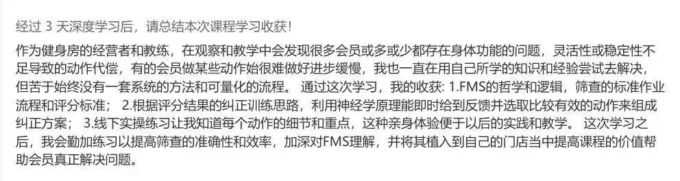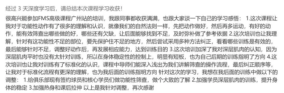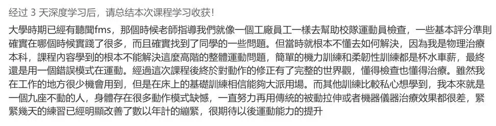 随着FMS课程的深入推广,越来越多的教练也加入到学习中来,他们在工作中将 FMS 和私教课进行了很好的结合应用,我们也收到了很好的反馈。