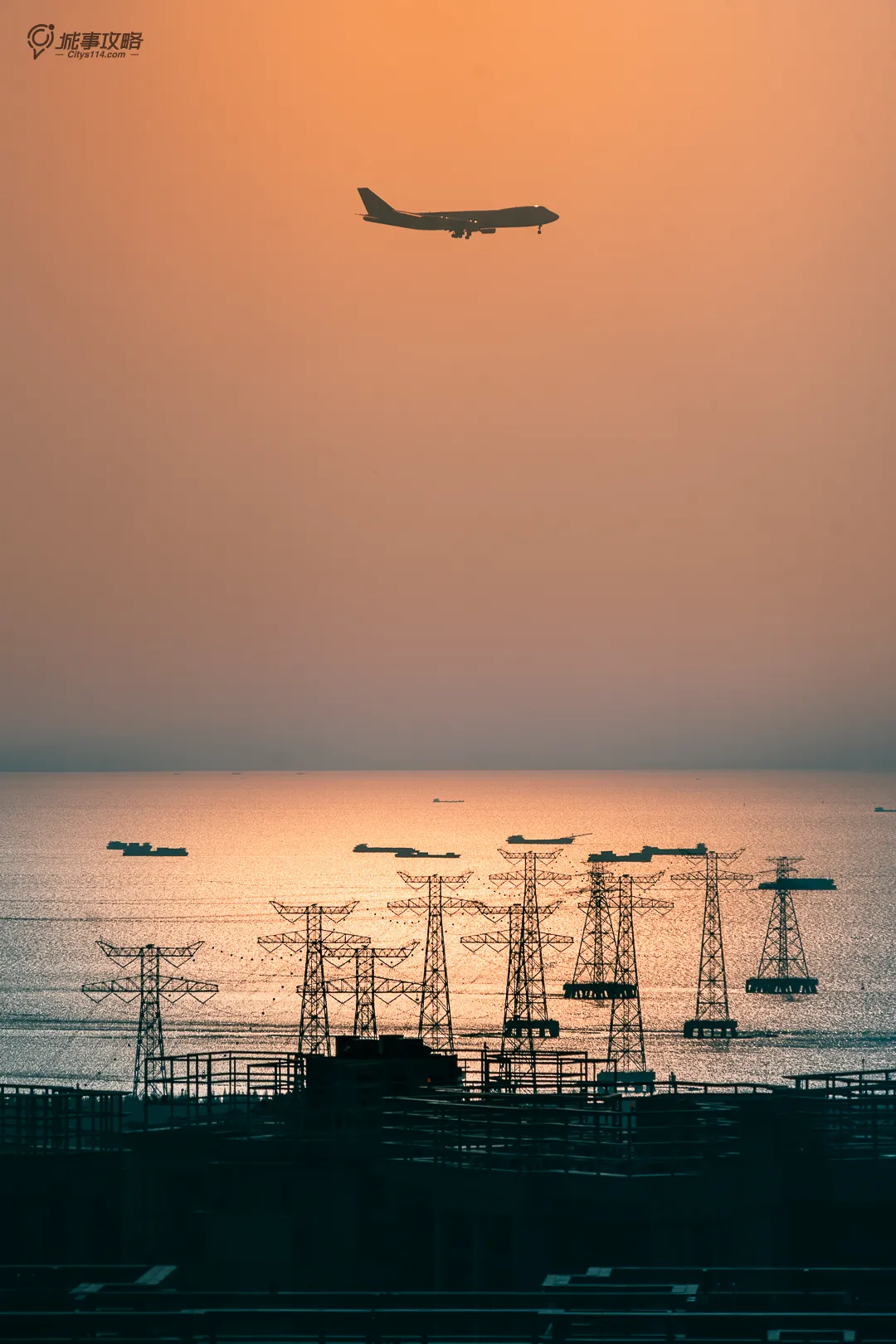起降的飞机和海上航行的邮轮