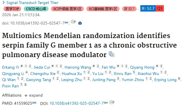 通过整合八个pQTL与两个eQTL数据集,并采用SMR、两样本MR与共定位分析三级验证,将 SERPING1 确定为COPD最高证据等级(Tier 1)的因果基因。其pQTL与降低的COPD风险及改善的FEV₁、FEV₁/FVC等肺功能指标显著相关。