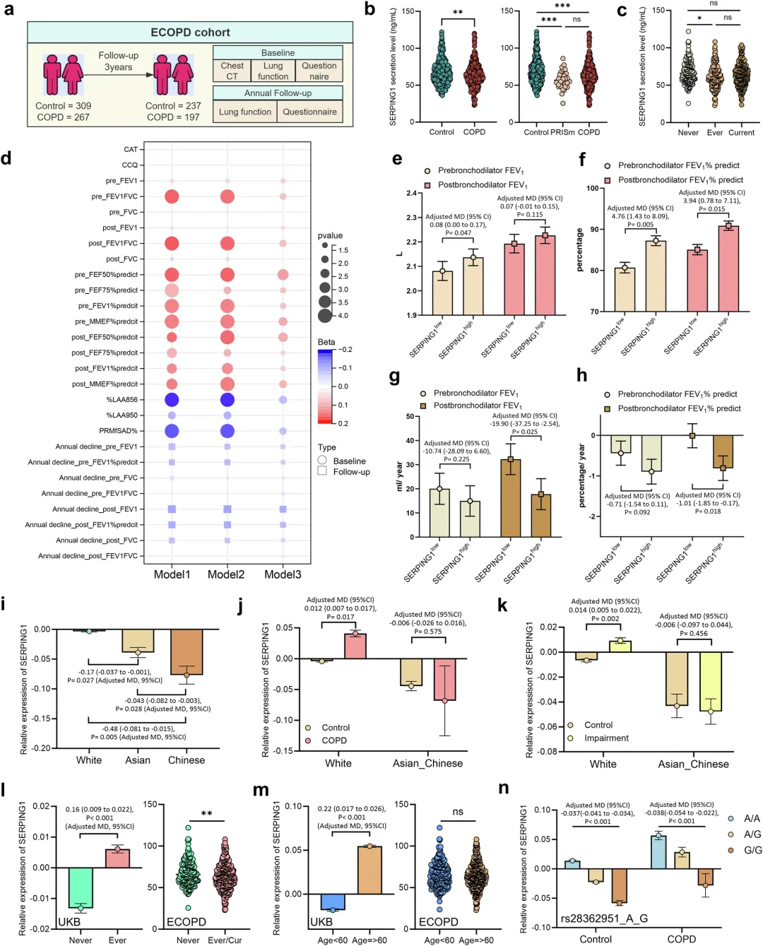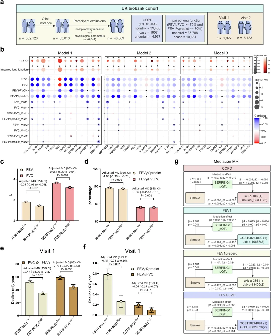 在UK Biobank近4.6万人群中证实,基线较高的血浆SERPING1水平与第一次随访时较慢的FEV₁年下降率显著相关。但在第二次随访时关联减弱,提示其更适于作为短期肺功能下降的生物标志物。