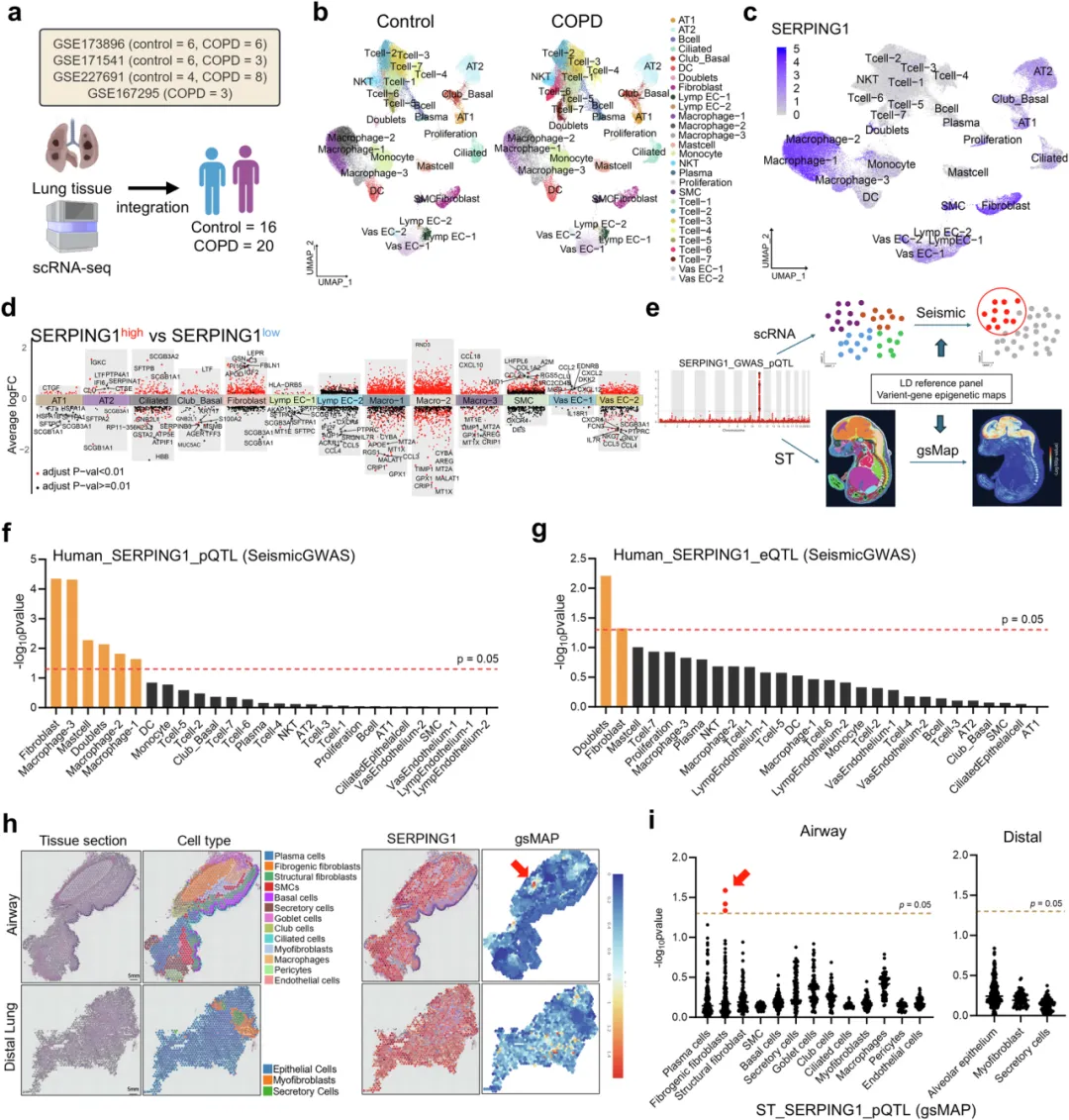 综合运用scRNA-seq、空间转录组及遗传定位分析(seismicGWAS, gsMAP),发现SERPING1的遗传信号与蛋白作用主要富集于肺成纤维细胞,其次为巨噬细胞,明确了其发挥功能的细胞场所。