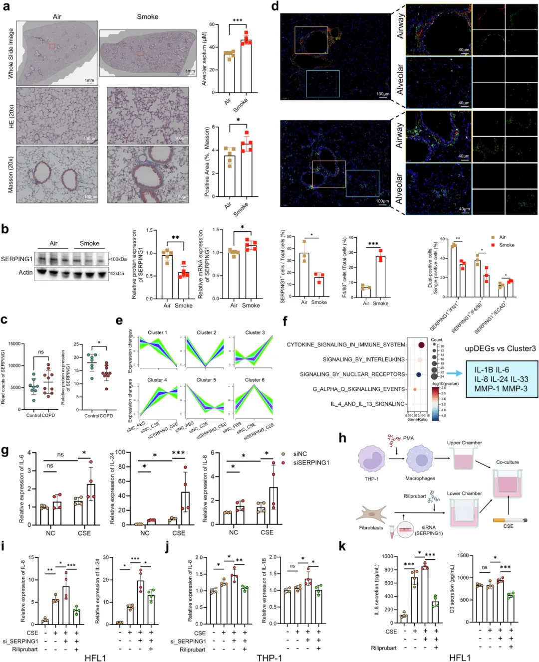 在人肺成纤维细胞中敲低SERPING1,会显著加剧CSE诱导的炎症因子(如IL-6, IL-8, IL-1β)释放,并破坏弹性纤维相关基因表达,验证了其在抑制成纤维细胞炎性转化及维持基质健康中的关键作用。