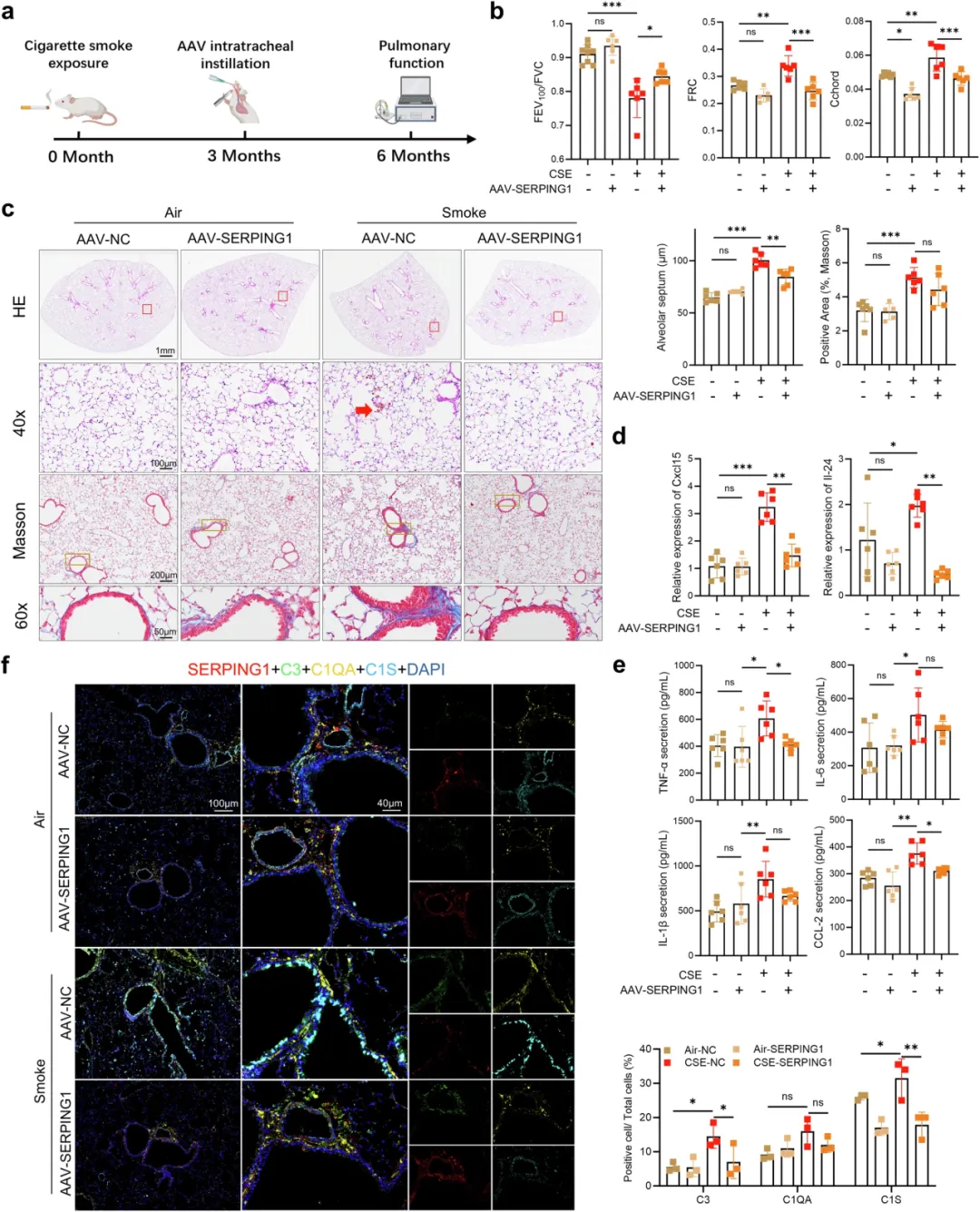 在香烟烟雾诱导的COPD小鼠模型中,AAV介导的肺特异性SERPING1过表达能显著改善肺功能、减轻肺泡隔破坏、抑制肺部炎症,并上调弹性纤维生成基因。该疗效主要通过作用于成纤维细胞实现。