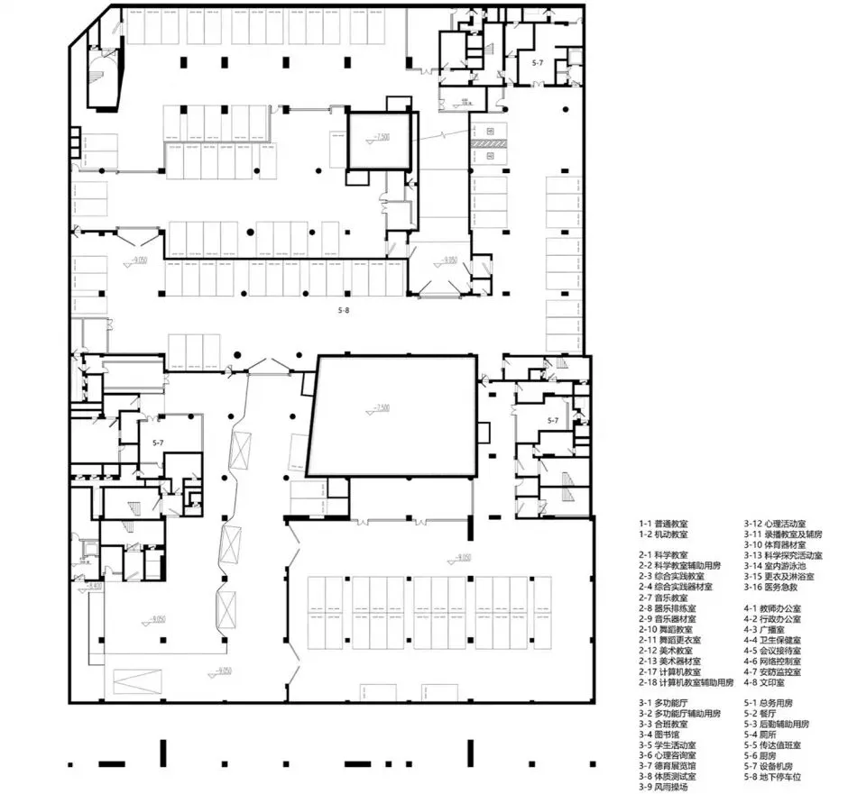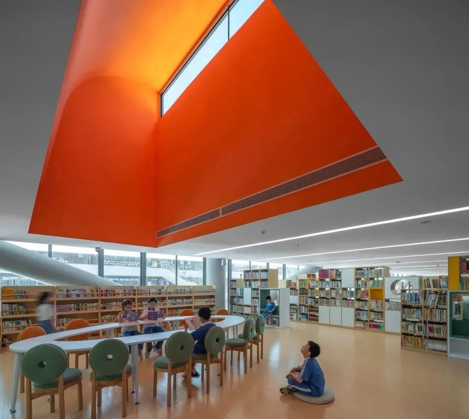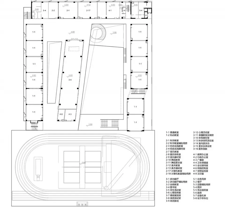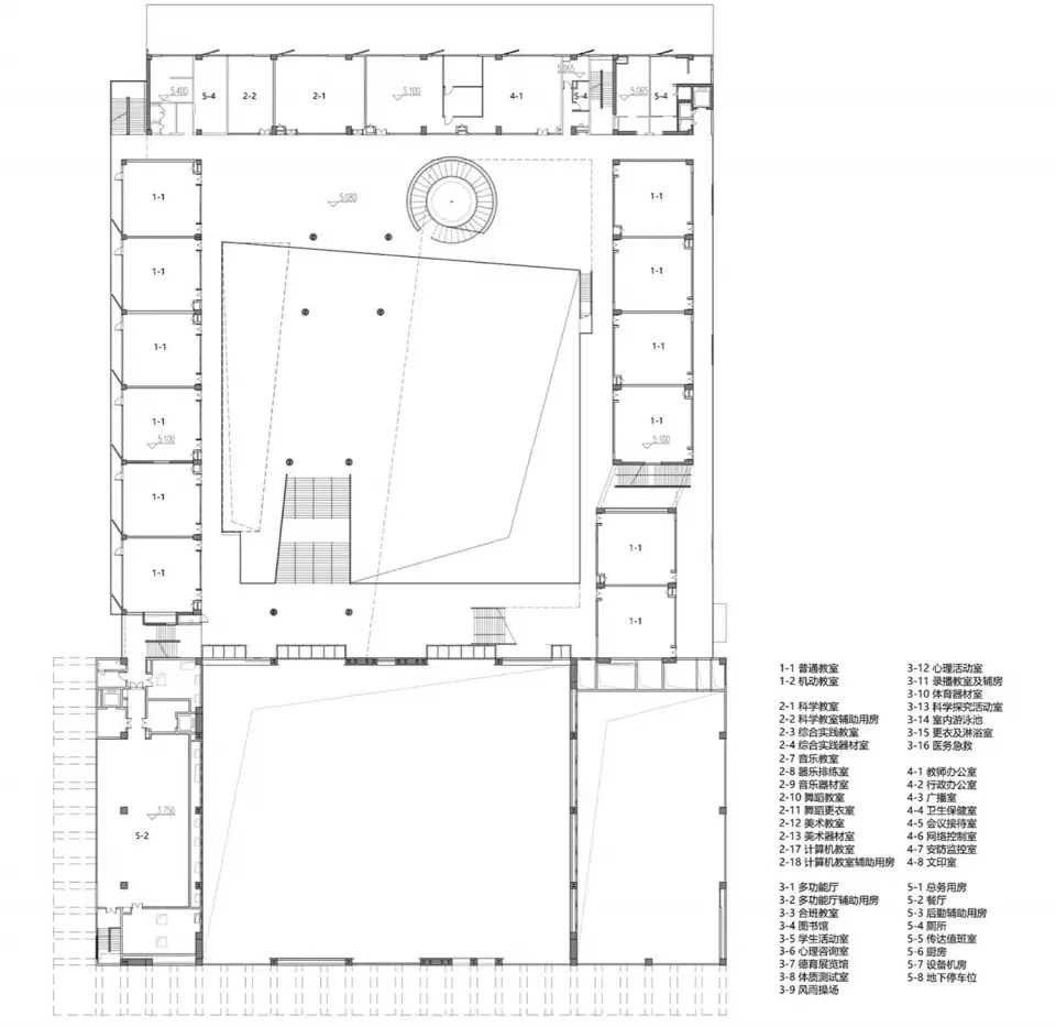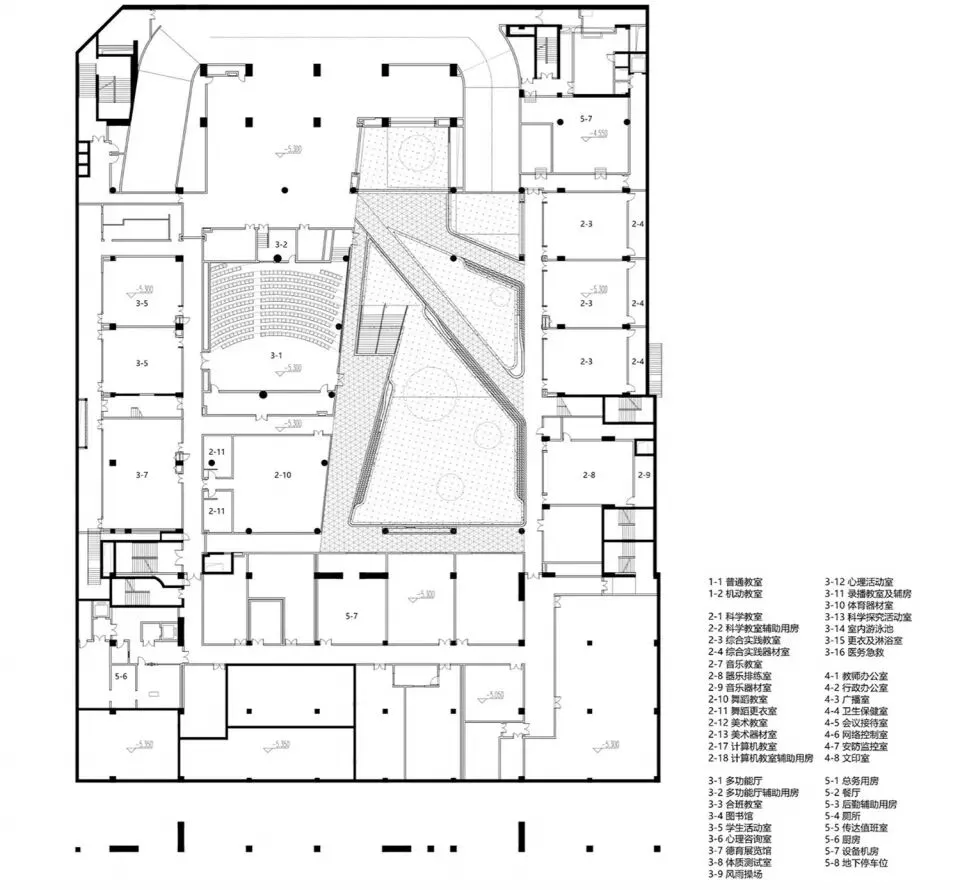 中央庭院不仅是视觉焦点,更是学校各类活动的核心舞台。图书馆、报告厅、体育馆、游泳馆、艺术教室、科学实验室等共享功能空间面向庭院开放,使学习从封闭的教室延伸到整个校园。这种布局鼓励跨年级交流、激发偶然相遇与知识碰撞,将“开放教育”理念具象化为可感知、可体验的空间现实。