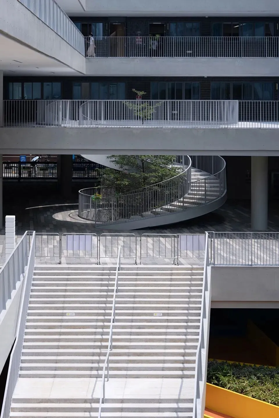 垂直维度的平等化:传统教学楼中,高层班级的学生往往难以在课间到达地面活动场地。多平台设计消除了这种垂直不平等,确保每个学生,无论所在楼层高低,都能平等享受活动空间。这些平台不仅是过渡区域,更是小型社交中心、临时展览空间和非正式学习场所,极大地丰富了校园生活的层次。