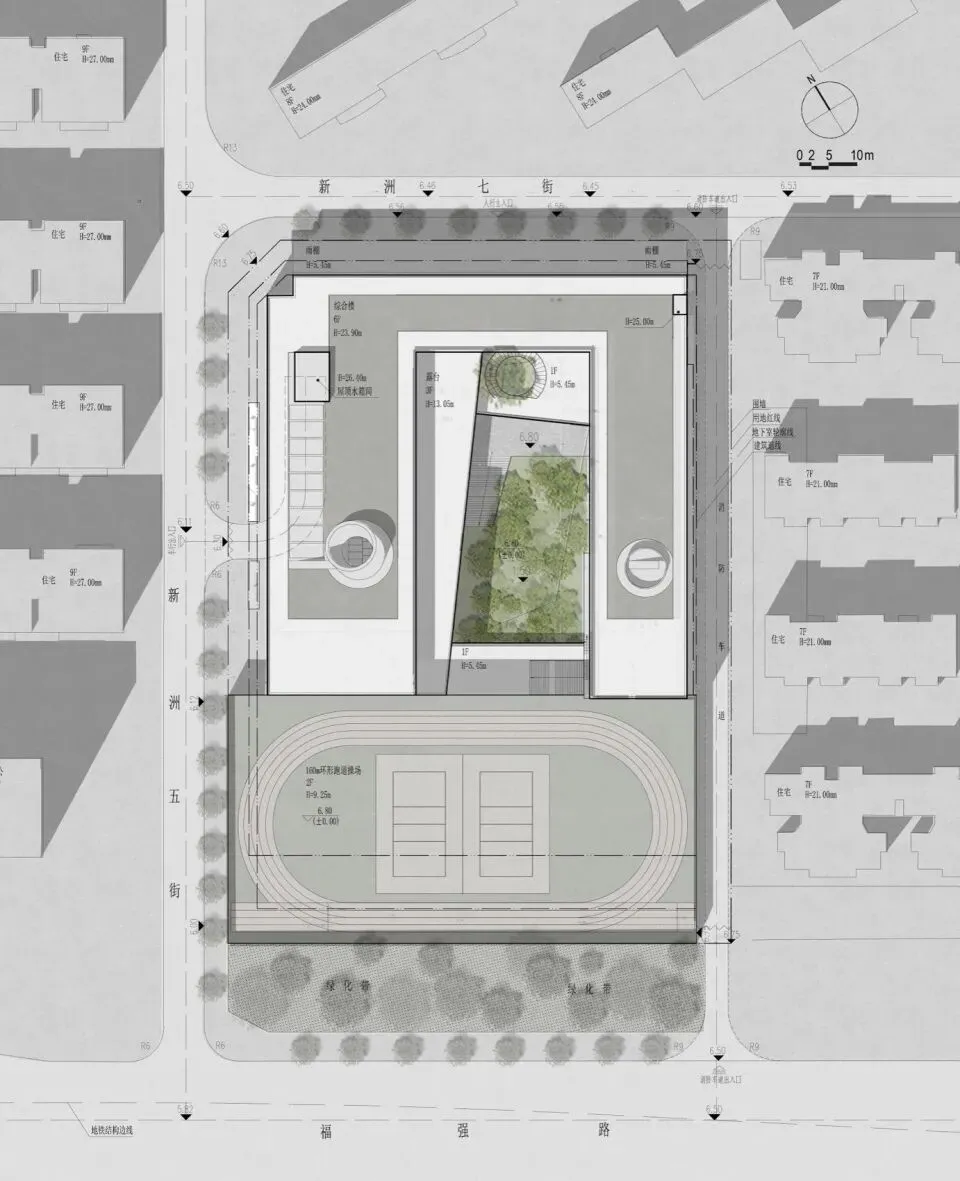 场地西南侧福强路是城市主干道,噪音较大。西北新洲五街,东北侧新洲七街为城市支路是建筑组织出入的主要界面。项目整体容积率2.26,是深圳高密度校园的典型。规避噪音,“上天下地”寻找空间,很快通过多方案比较得到了一个较为理性的总体布局,随后便展开建筑的设计。