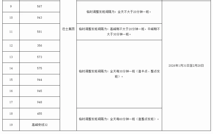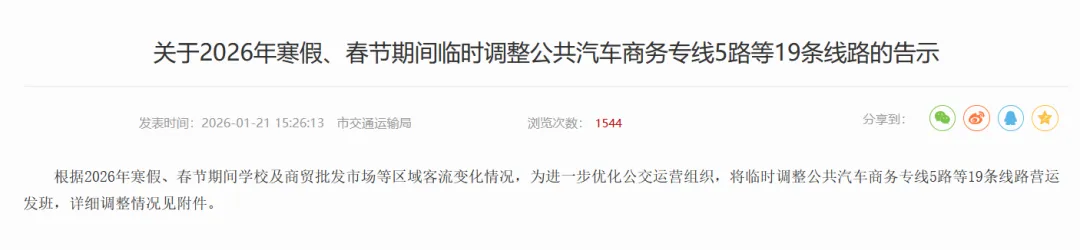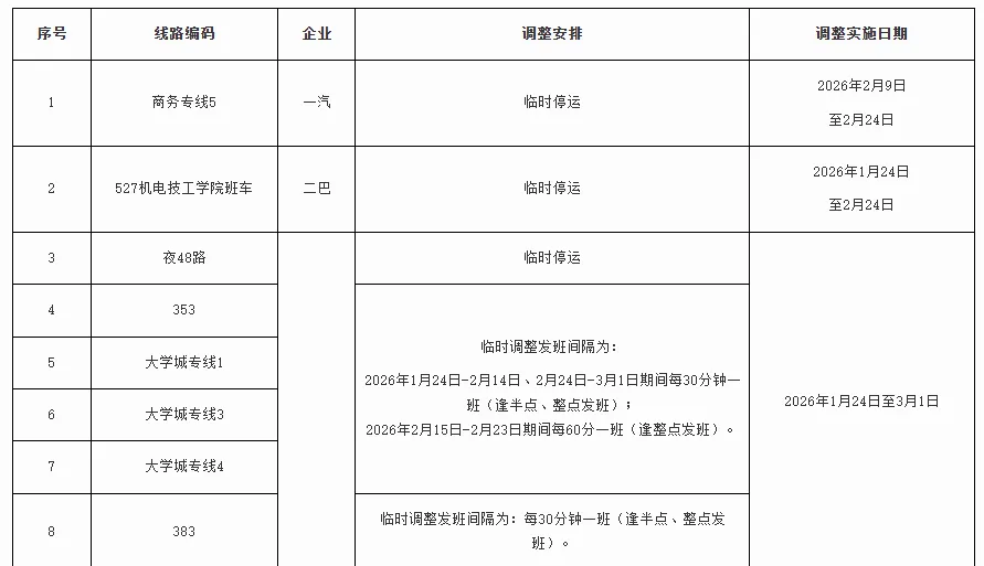 根据2026年寒假、春节期间学校及商贸批发市场等区域客流变化情况,为进一步优化公交运营组织,将临时调整公共汽车商务专线5路等