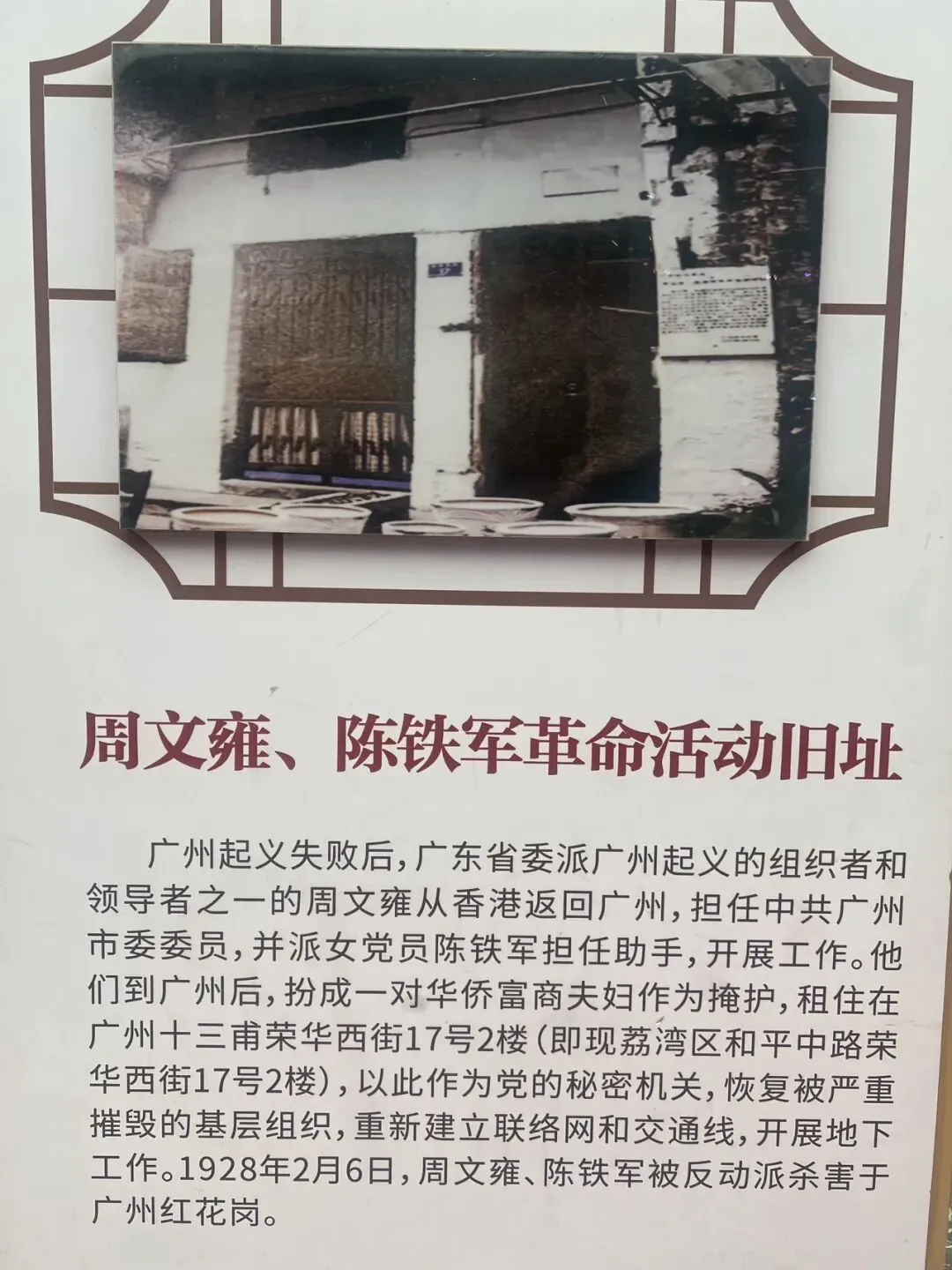 第二次鸦片战争中,十三行被焚毁后商业逐步迁入上、下九路,民国时期上下九已成为广州贸易中心之一。1928年广州对城市进行规划建设,在上下九路等商业集中地带建设了具有岭南特色的骑楼街。而革命的浪潮也在广州不断的蔓延,我们熟知的革命故事《刑场上的婚礼》主人公周文雍和陈铁军也是在这附近开展革命活动,因为有无数这样革命先烈的前赴后继的牺牲,才有今天这样的幸福生活。