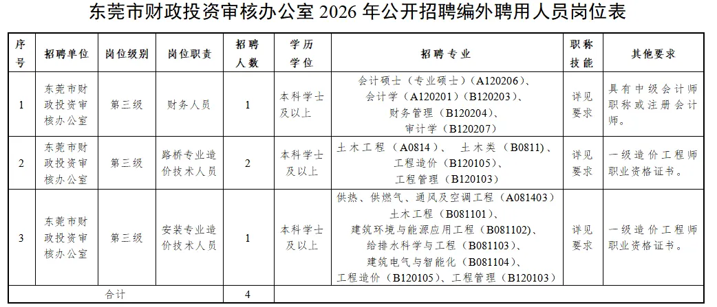 东莞市财政投资审核办公室合计招聘普通聘员4人。