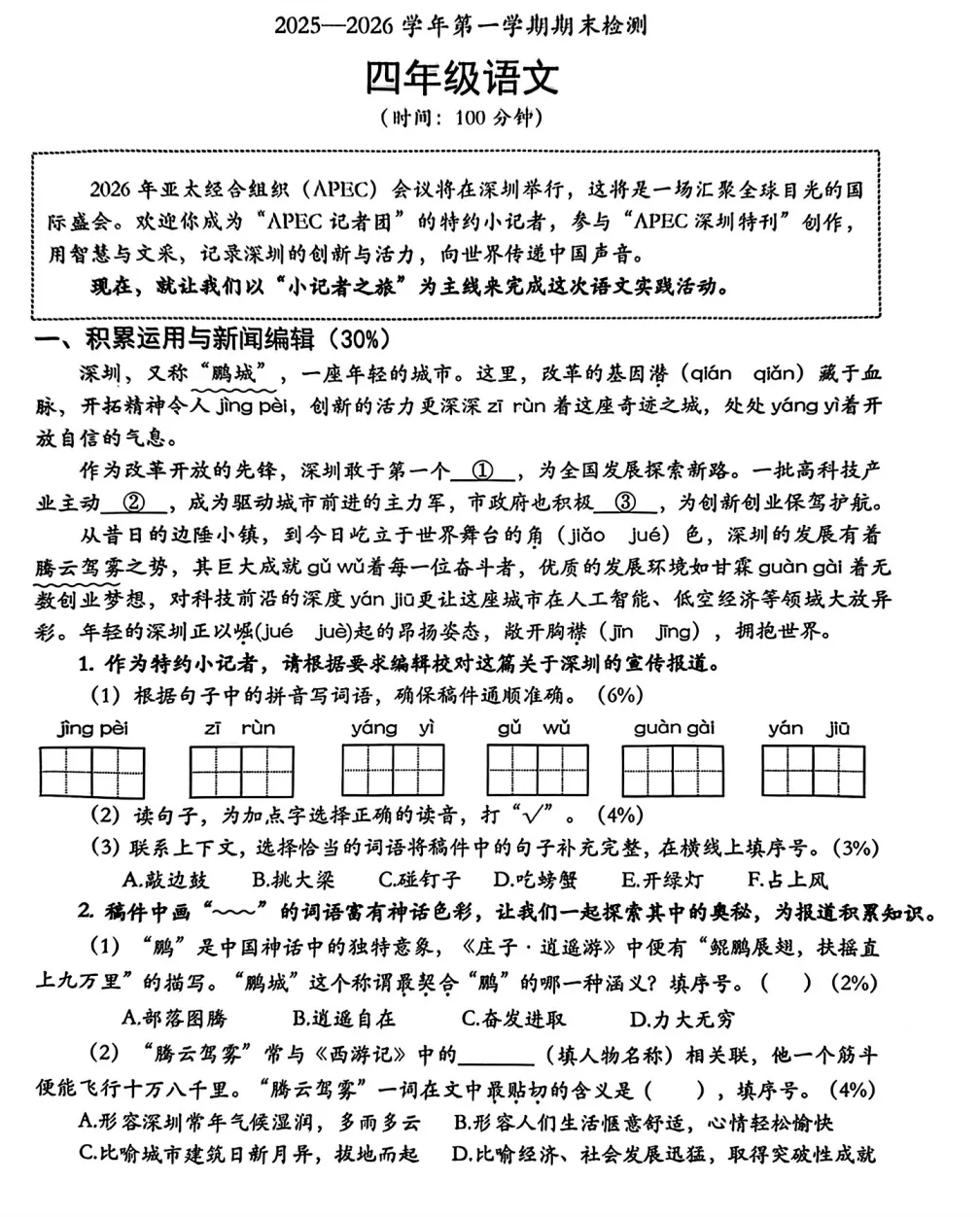 深圳四年级期末语文试卷,到底想干什么?