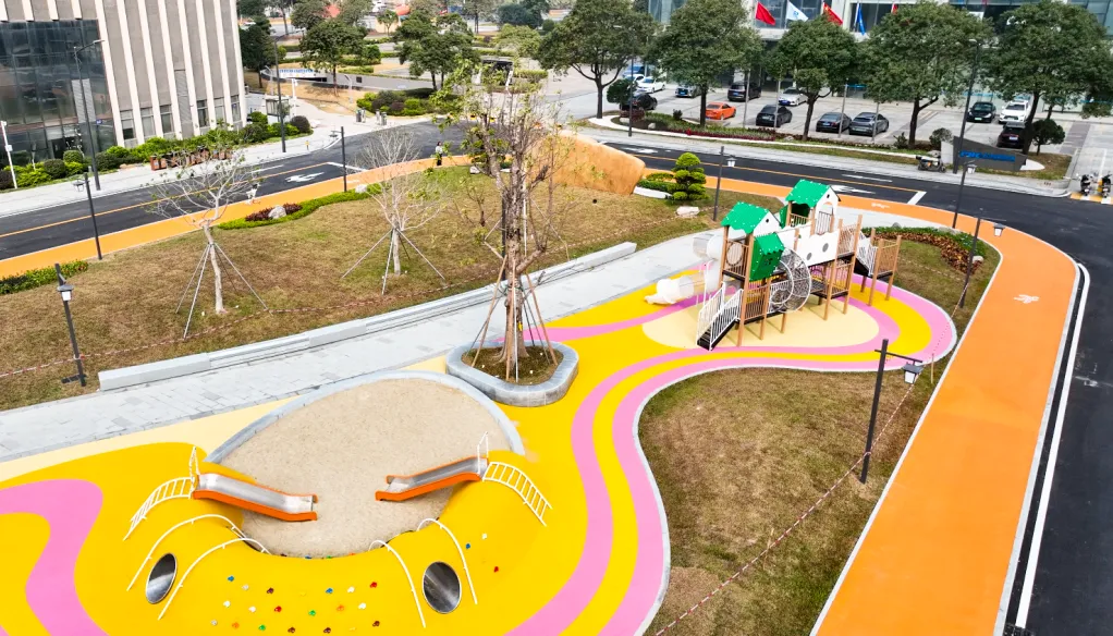 ⏩东莞港中央公园:占地约6100平方米,包含环形跑道、儿童游乐区、休闲广场等功能区域,绿化优美、照明温馨,是休闲散步、亲子活动、健身锻炼的理想场所。