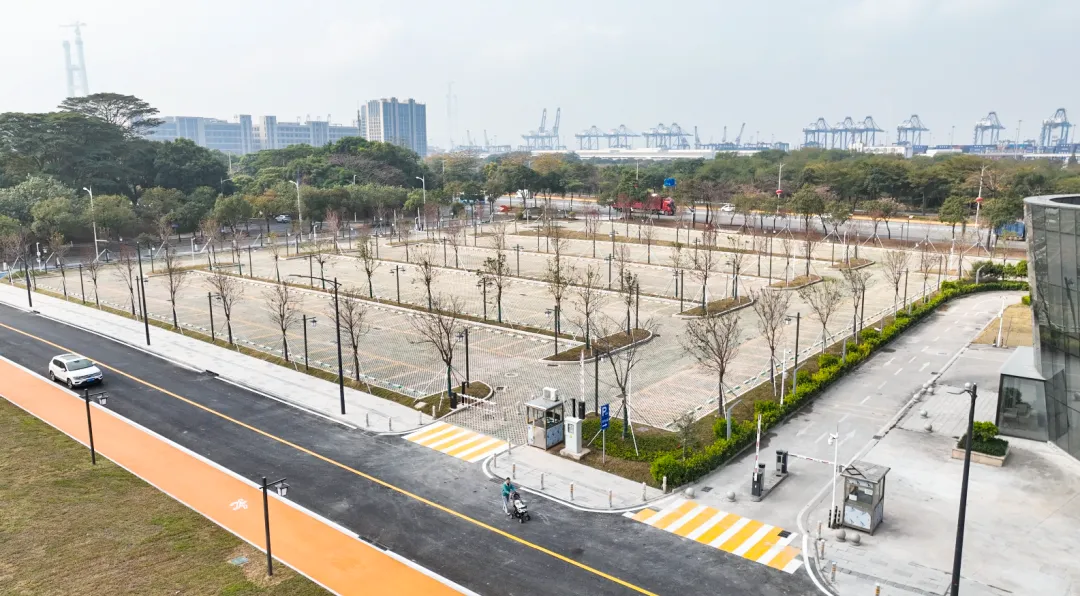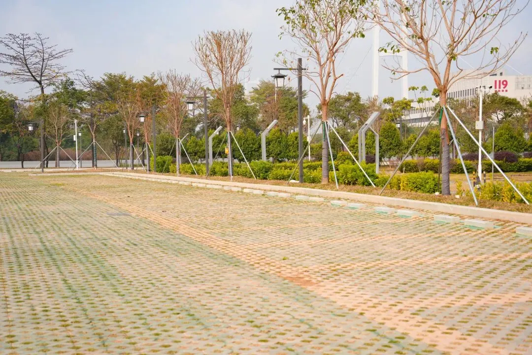 生态停车场显著缓解周边办公、商业及居住区停车压力,采用植草砖设计,夏天降温又美观。
