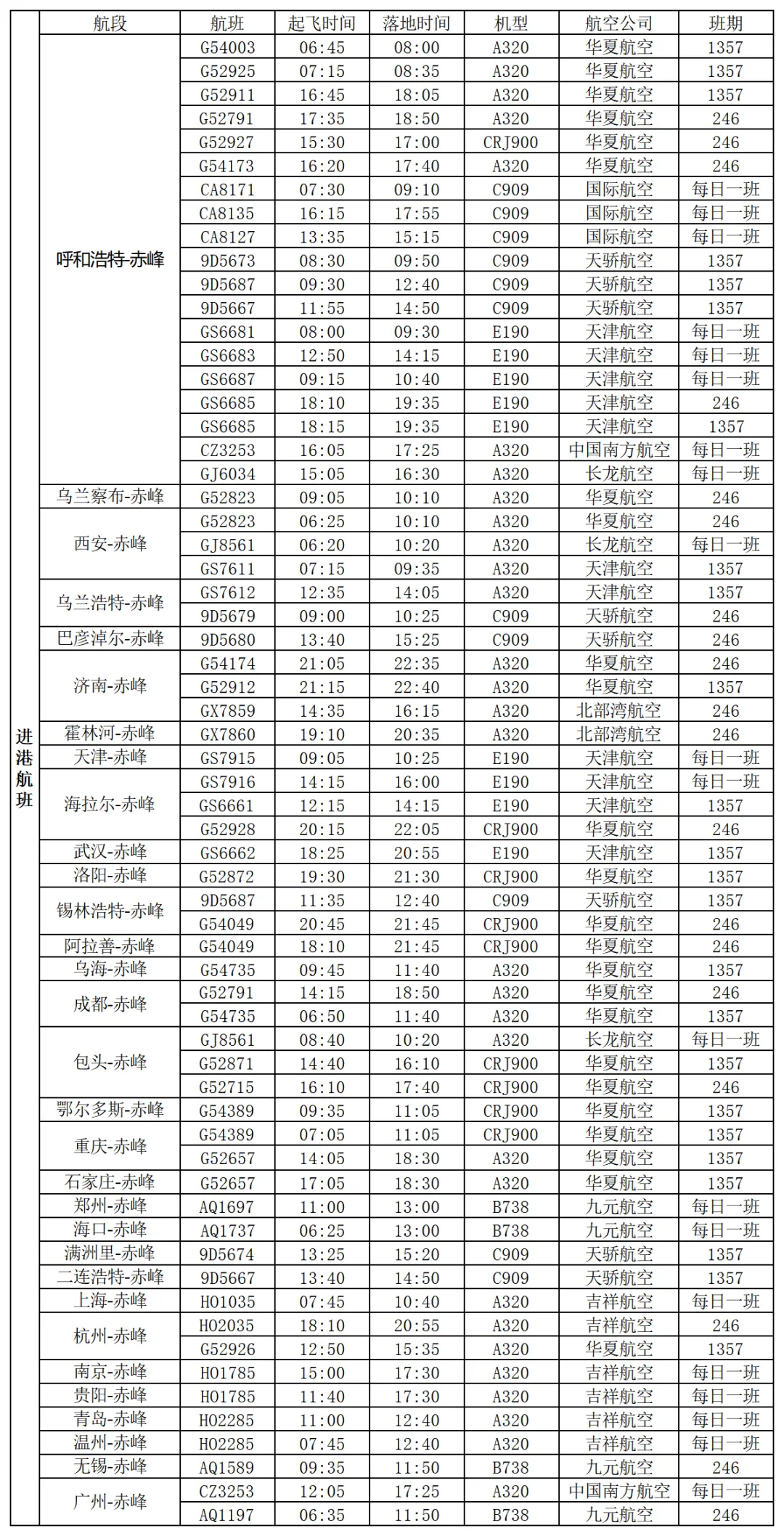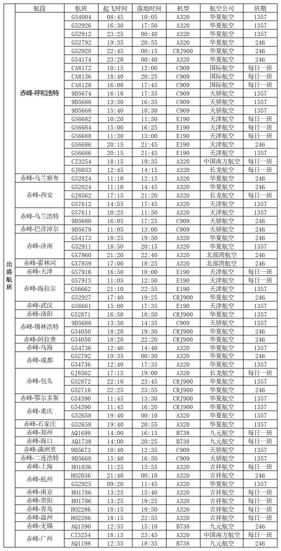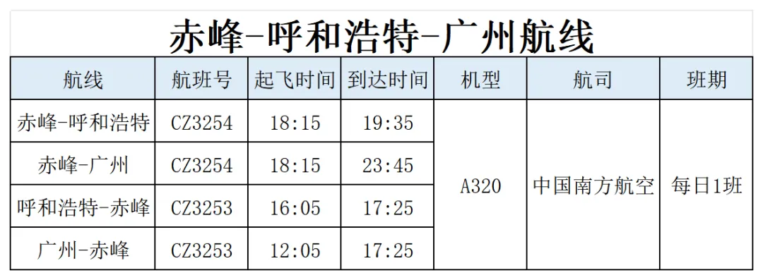 新开通赤峰=呼和浩特=广州航线