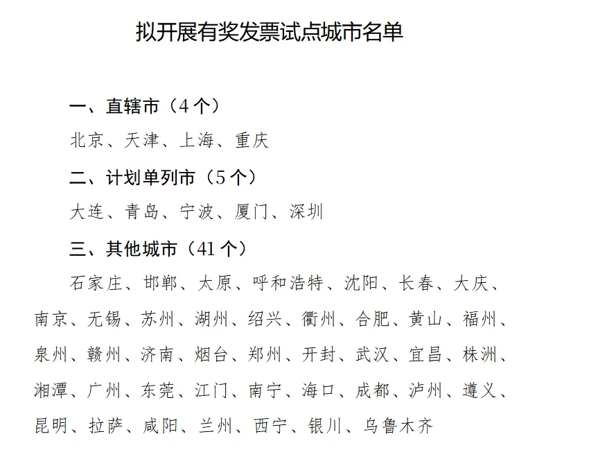 商务部、财政部、国家税务总局1月23日对外公示拟开展有奖发票试点城市名单,包括北京、上海、深圳等50个城市入选。