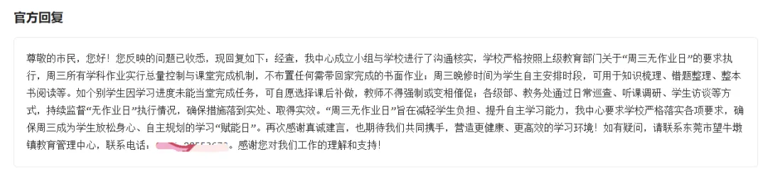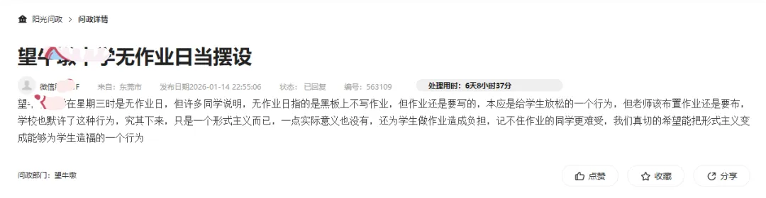 为了进一步减轻中小学生的课业负担,这个学期很多地区都推设置了“无作业日”,即每周有一天不布置任何书面或机械重复性作业,鼓励学生通过实践活动、兴趣探索等方式实现多元发展。然而,正如其他教育减负措施一样,“无作业日”制度在实施过程中也存在沦为形式主义的现象。近日,有东莞的中学生在问政平台上留言,吐槽学校的“无作业日”变成了摆设。这位学生表示,其就读的学校将星期三设置为“无作业日”,本来这一天是给学生放松的,但实际上,老师该布置作业还是会布置作业,学校也默许这种行为,结果就是“无作业日”一个形式主义而已,一点实际意义也没有,很多同学都吐槽“无作业日”指的是黑板上不写作业,但作业还是要写的,并且记不住作业的同学反而更难受。他(她)希望学校别搞形式主义,让“无作业日”真正成为能够为学生造福的一个行为。针对该情况,东莞市望牛墩镇教育管理中心公开回复称:我中心成立小组与学校进行了沟通核实,学校严格按照上级教育部门关于“周三无作业日”的要求执行,周三所有学科作业实行总量控制与课堂完成机制,不布置任何需带回家完成的书面作业;周三晚修时间为学生自主安排时段,可用于知识梳理、错题整理、整本书阅读等。如个别学生因学习进度未能当堂完成任务,可自愿选择课后补做,教师不得强制或变相催促;各级部、教务处通过日常巡查、听课调研、学生访谈等方式,持续监督“无作业日”执行情况,确保措施落到实处、取得实效。“周三无作业日”旨在减轻学生负担、提升自主学习能力,我中心要求学校严格落实各项要求,确保周三成为学生放松身心、自主规划的学习“赋能日”。从教管中心的回复来看,学校严格按照上级教育部门的要求执行“周三无作业日”,并没有布置任何需带回家完成的书面作业。但当事学生反映的却是“周三无作业日”老师依旧布置作业,只是没有在黑板上写布置那些作业而已。到底是怎么回事呢?有可能如投诉者所反映的,有老师仍旧在“周三无作业日”布置作业,并得到了学校的默许;也有可能是老师在“周三无作业日”时建议学生做一些拓展学习,只是在措辞上使用了带有强制性的字眼,导致部分学生及家长产生了误解。不管怎样,教育主管部门都应该进行深入的调查,了解事情的真实情况,解开学生及家长们心中的疑惑。实际上,在“无作业日”等减负措施的执行过程中,学校、教师消极应对、沦为形式主义的现象并不少见,主管部门需要加强监管,引导学校及教师改变教育观念,督促学校及教师严格按照相关教育减负的要求执行。学校。教师消极执行的出发点可能是好的,但是却违背了国家的意志,同时也增加了学生的课业负担,损害他们的身心健康,导致他们产生厌学心理,学校、教师的公信力也受到破坏,结果适得其反。因此,既然教育部门有规定,就按照相关要求去执行比较好。
